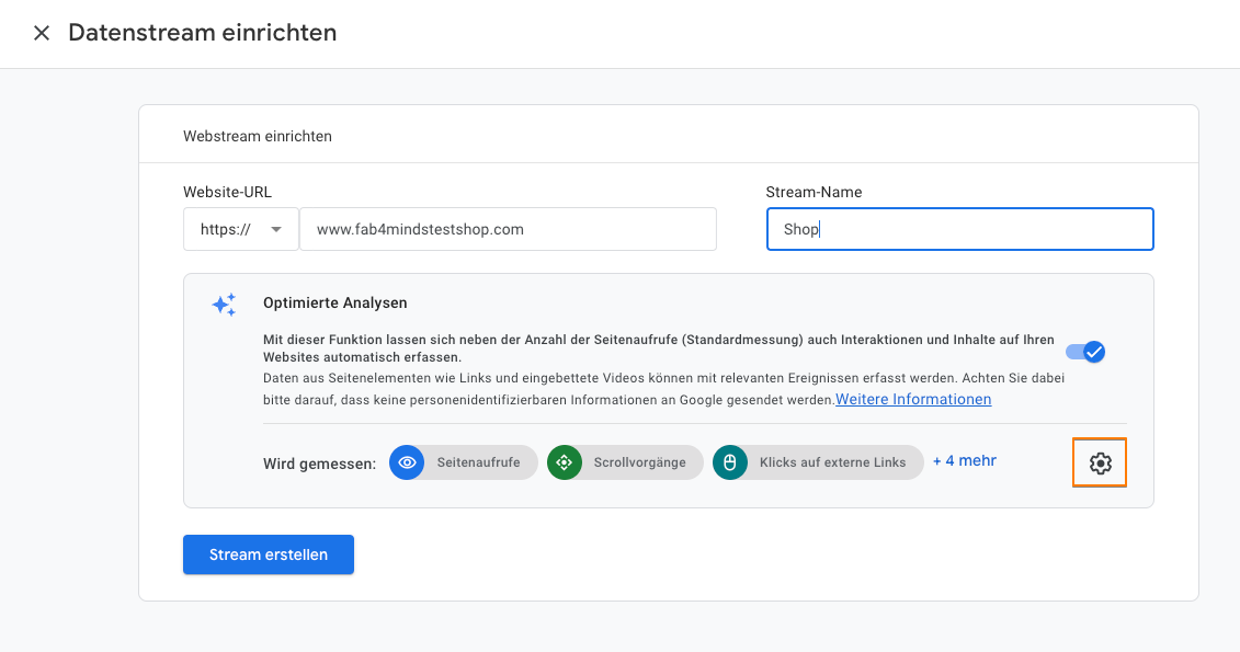 Wenn im Datenstream “optimierte Analysen” aktiviert bleiben sollen, sollte zu den Einstellungen dieser gewechselt werden ( - siehe Screenshot)