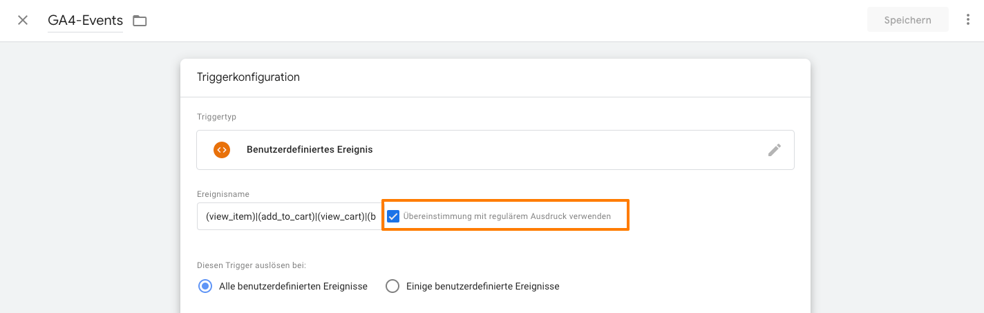 Um eCommerce-Events in Google Analytics zu tracken, wird zuerst ein Trigger angelegt, welcher bei jedem der eCommerce-Events auslöst. Um nicht für jedes Event einen eigenen Trigger anlegen zu müssen, werden alle gewünschten Events folgendermaßen als “Ereignisname” angegeben: