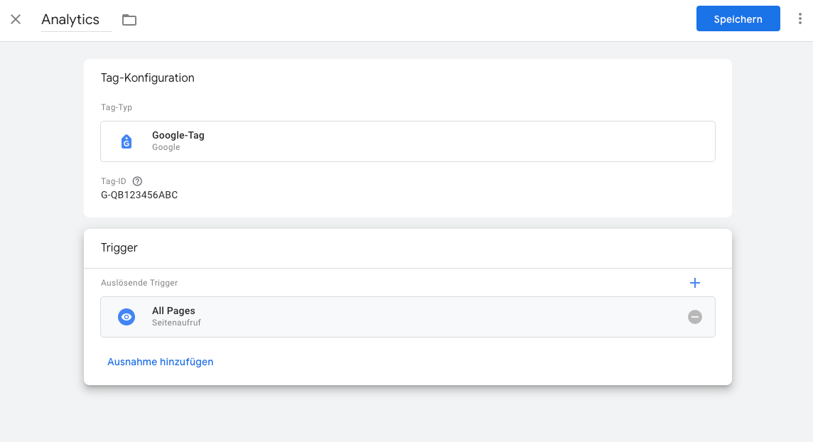 Nun wird im Tag Manager ein Google Tag angelegt, in dem die Mess-ID aus Google Analytics eingetragen und ein Trigger, der auf jeder Seite auslöst hinzugefügt wird.