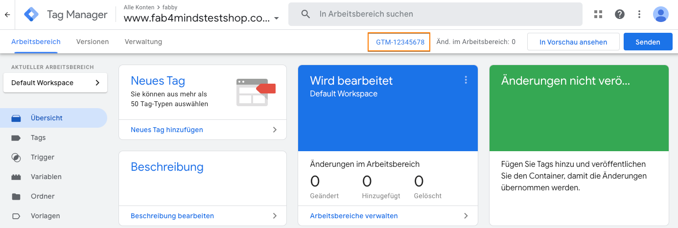Nun erscheint ggf. ein Popup mit Quellcode, um den Tag Manager zu installieren. Dieses kann geschlossen werden. Der Tag Manager Container ist nun erstellt und die zugehörige ID (siehe Screenshot) kann (am Besten nachdem die restliche Konfiguration erfolgt ist) an fab4minds übermittelt werden.