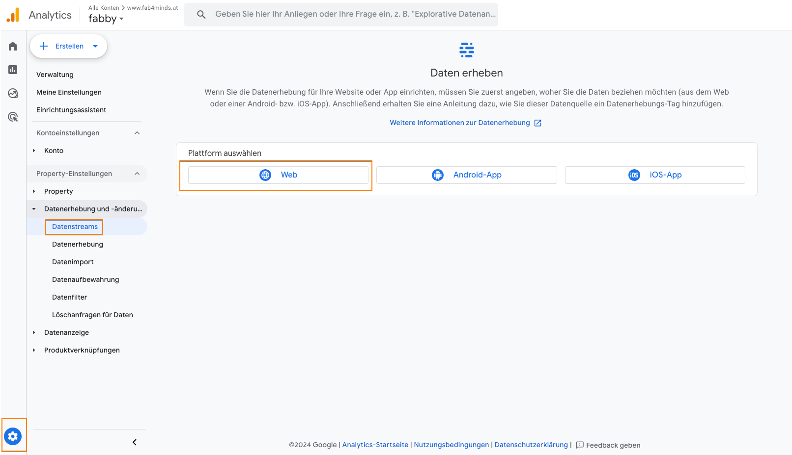 Unter https://analytics.google.com/ werden ein Analytics-Konto und eine Analytics-Property (GA4) erstellt ( - Hilfe hierzu gibt es u.a. unter https://support.google.com/analytics/answer/9304153?sjid=13515241101390437398-EU ) Anschließend wird ein Datenstream vom Typ “web” angelegt. Entweder wird man direkt dazu aufgefordert oder navigiert händisch zu den Datenstreams und legt einen an ( - siehe Screenshot)