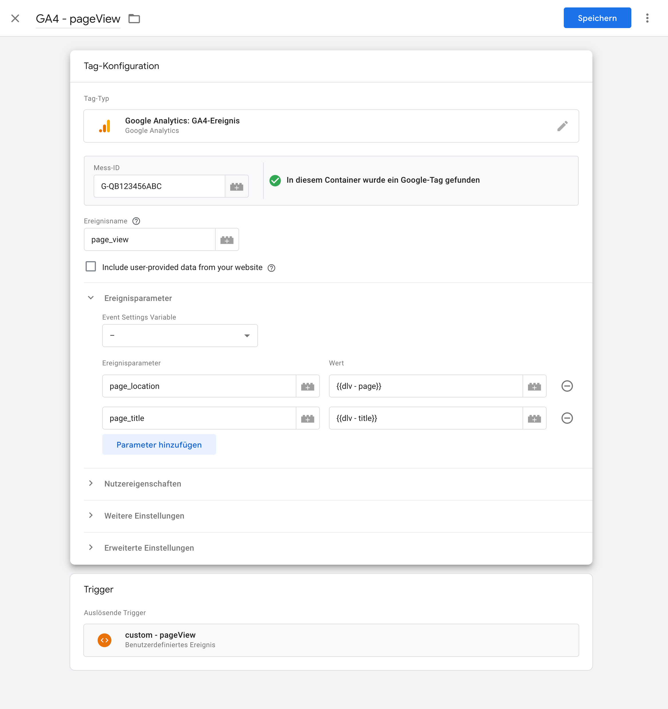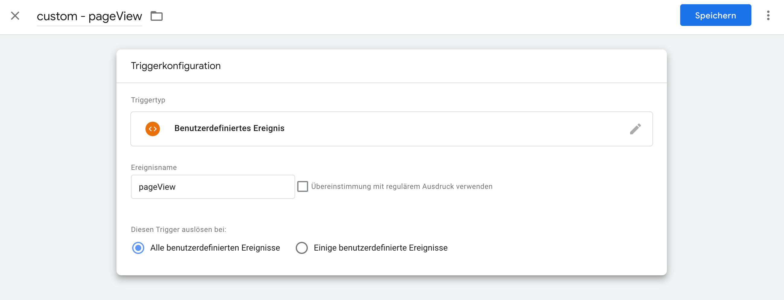 - Anlage eines Triggers vom Typ “Benutzerdefiniertes Ereignis” mit Ereignisname “pageView”