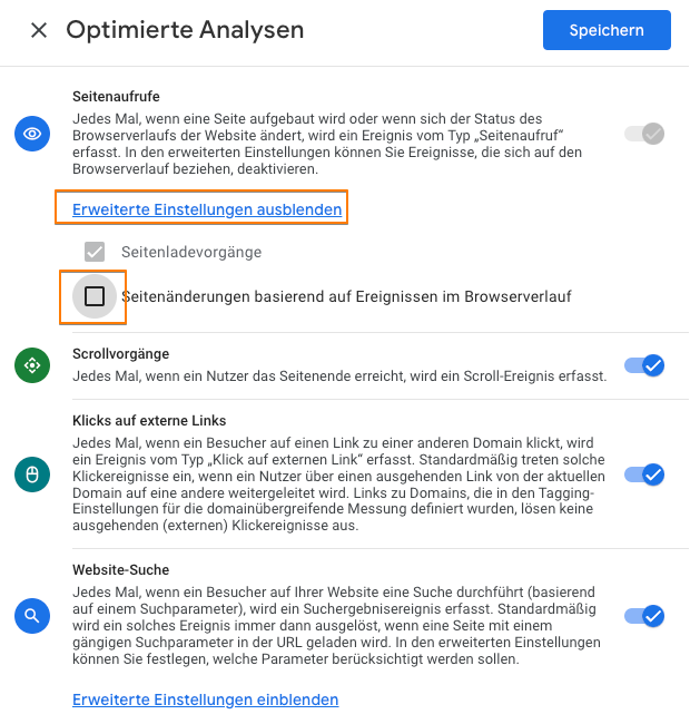 Hier sollten nun “Seitenänderungen basierend auf Ereignissen im Browserverlauf” deaktiviert werden, um zu verhindern, dass Seiten doppelt getracked werden.