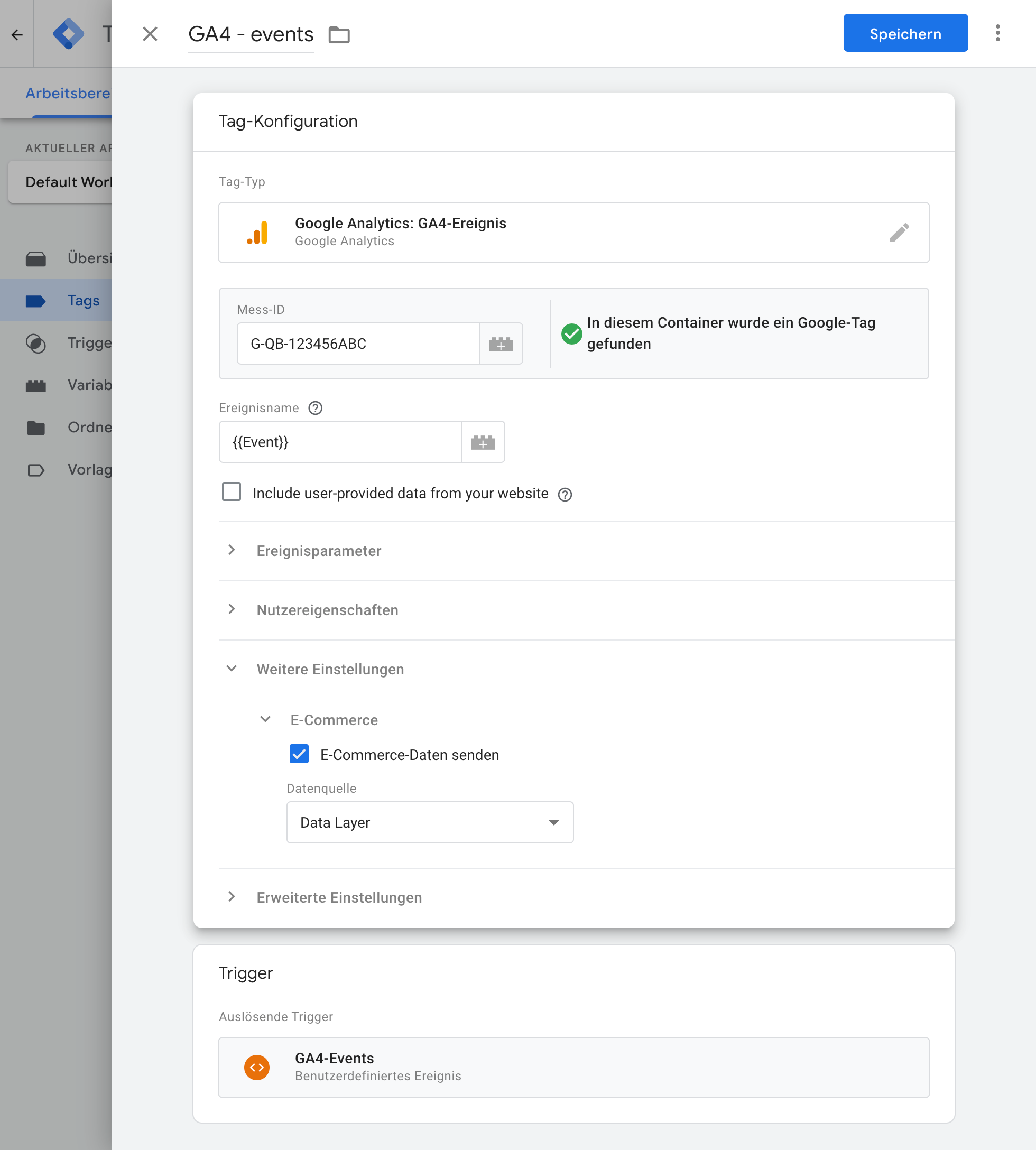 {{Event}} - Checkbox E-Commerce-Daten senden (im Reiter “weitere Einstellungen”) muss gesetzt sein und als Datenquelle wird “Data Layer” ausgewählt