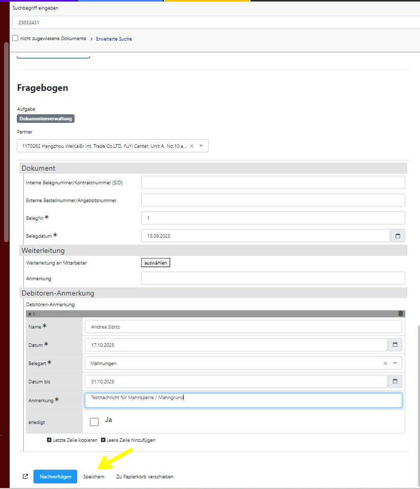 Wird eine Vorauszahlung angefordert erscheint im Arbeitsvorrat folgende Aufgabe: