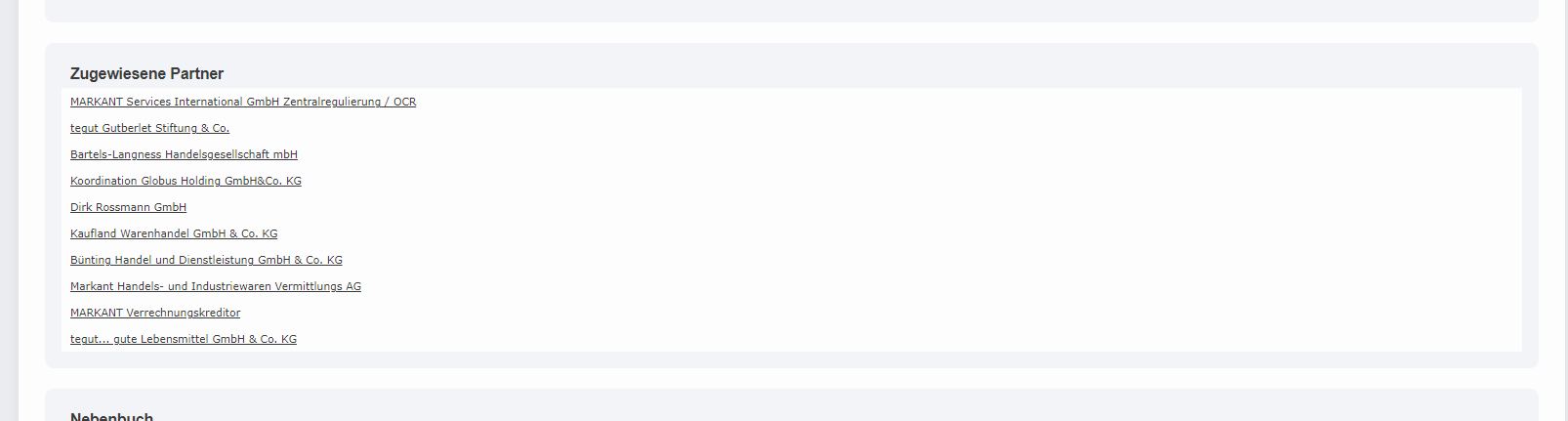Auf Kontoebne ist im Bereich Zugewiesene Partner ersichtlich welche Partner diesem Konto zugewiesen wurden - Pflege nur über den Partner möglich. Man kann über die Verlinkung direkt vom Konto auf den gewünschten Partner wechseln.