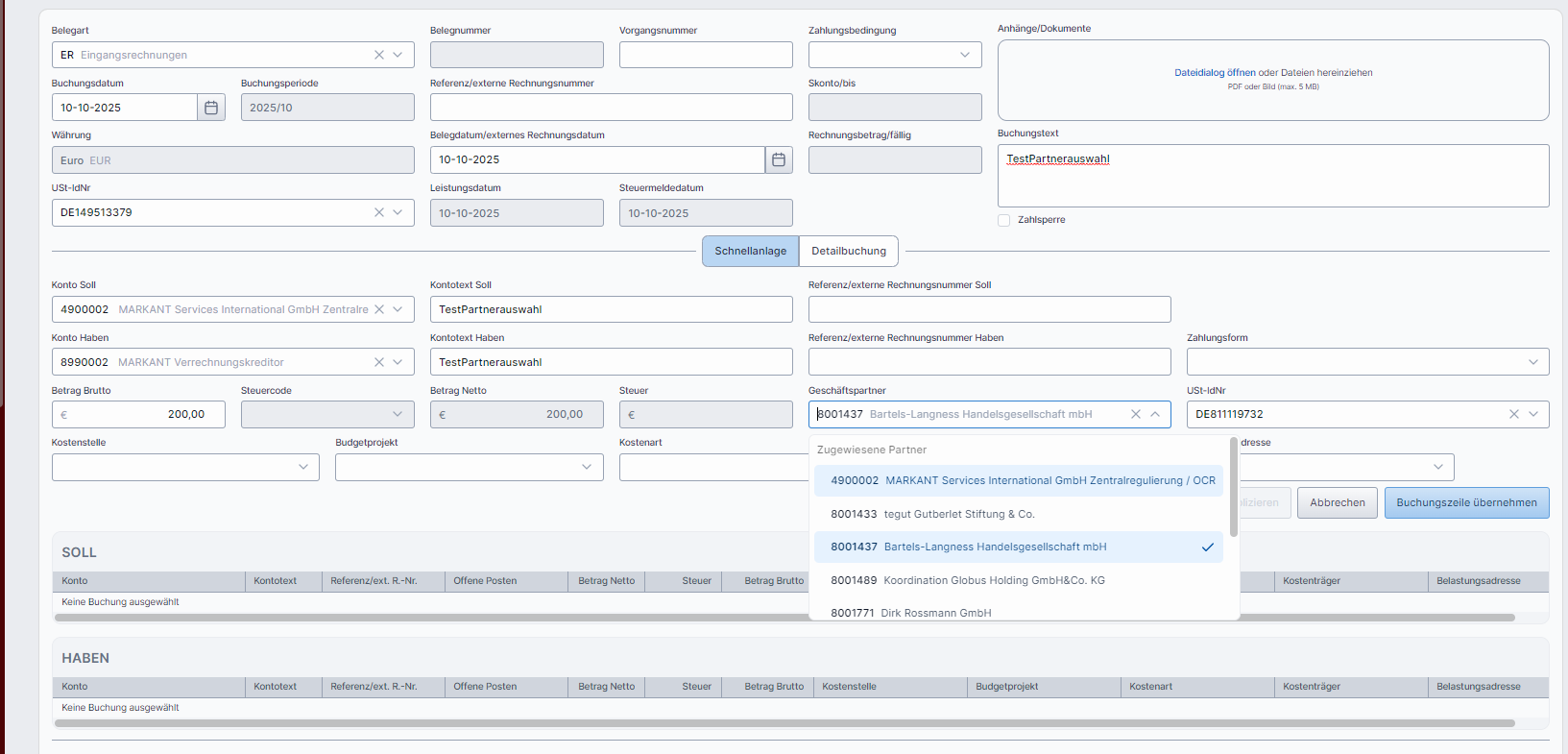Hier werden alle mit dem Konto verknüpften Partner per Drop-Down vorgeschlagen. Sollte aber ein nicht zugewiesener Partner benötigt werden kann man mit dem X das Feld leeren und den gewünschten Partner eintragen.