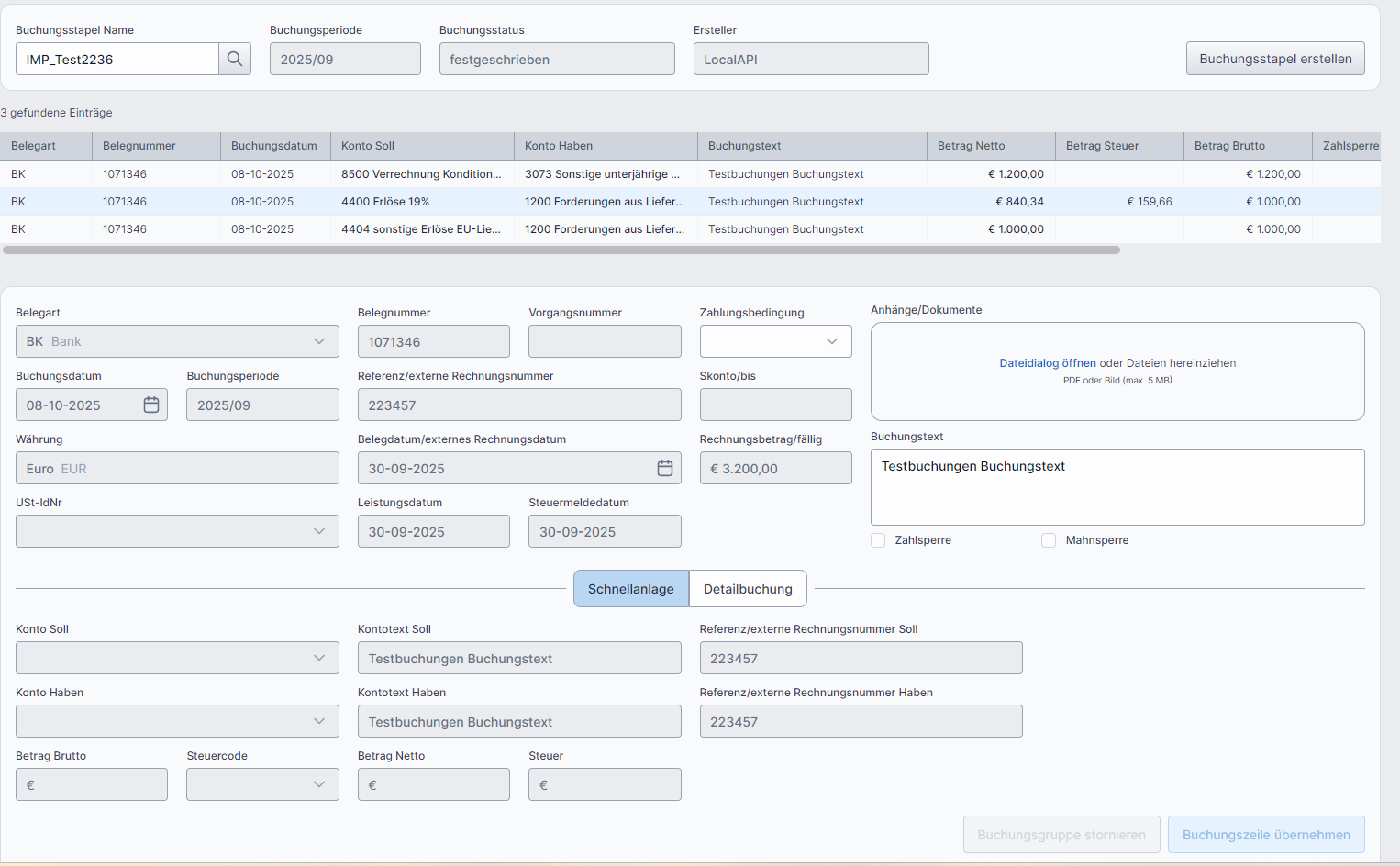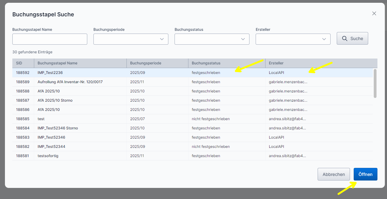 Der importierte Buchungsstapel trägt den Ersteller "LocalAPI" und ist automatisch festgeschrieben. Um die Buchungssätze ansehen zu können den gewünschten Stapel markieren und "Öffnen"