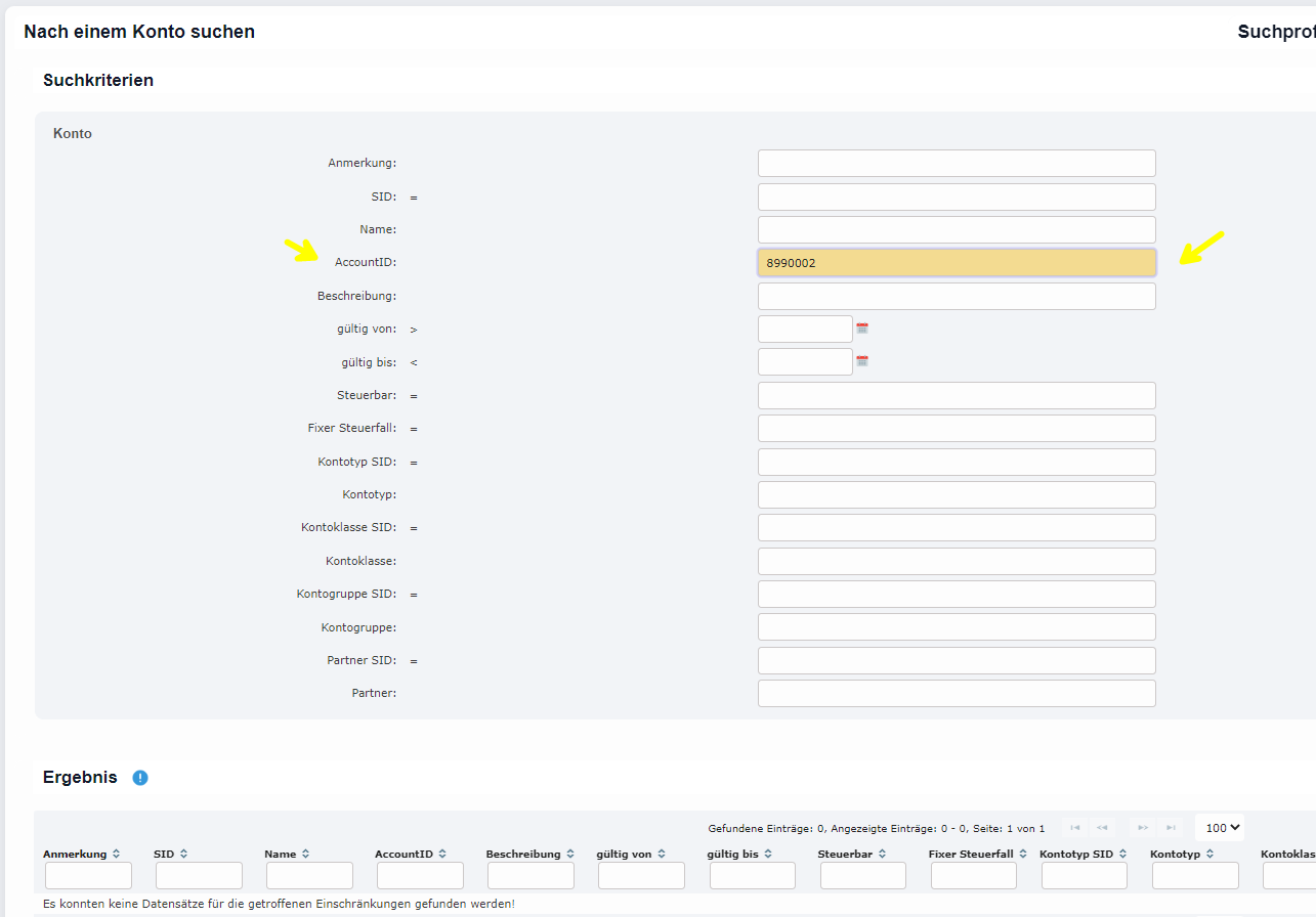 Hier kann direkt die zu verknüpfende Konto-Nummer eingetragen werden. Die Eingaben können mit Enter oder Suchen übernommen werden.