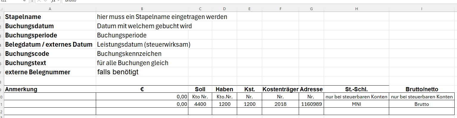Es besteht die Möglichkeit direkt Buchungen per Excel-Import anzulegen. Hierzu muss eine Excel mit nachstehenden Parametern befüllt werden (Vorlage wird bereitgestellt).