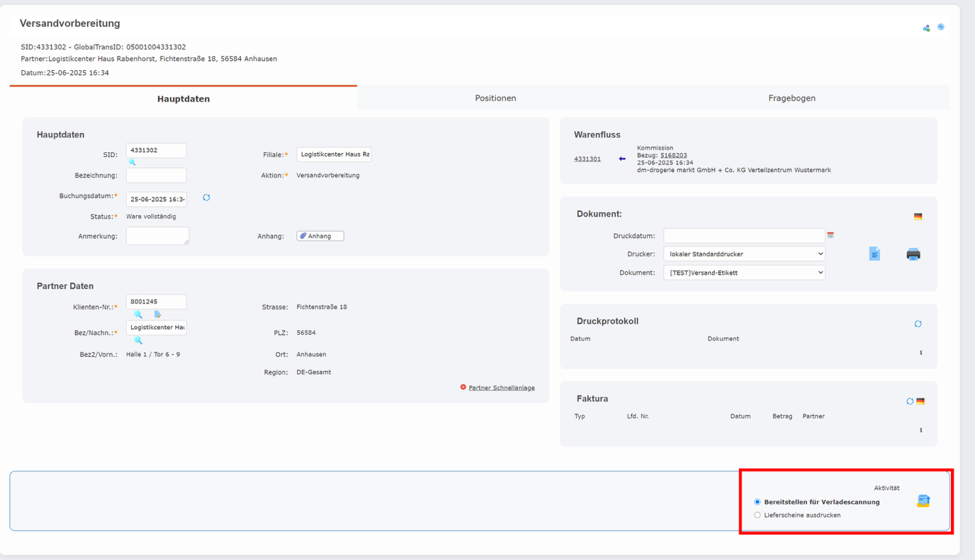 - Lager: Bei Lager-Aufträgen wird beim abschließen einer Kommission zuerst eine Versandvorbereitung angelegt. Anschließend kann über die Aktivität “Lieferscheine ausdrucken” die Dokumente gedruckt werden, und mit der Aktivität “Bereitstellen für Verladescannung” wird eineVerladung in den LKW angelegt. Diese Punkte werden nur solange automatisch angelegt, solange CSB den Versand bei DHL anmeldet und die Verladescannung durchführt.