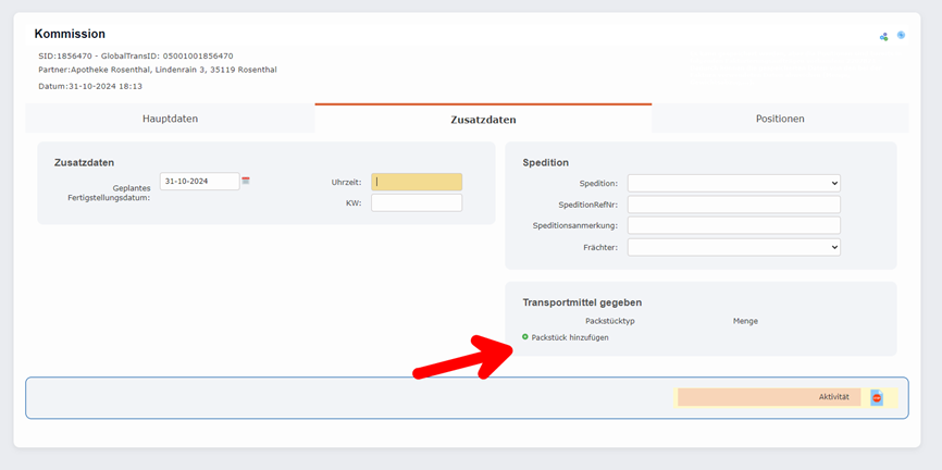 Durch die Aktivität „Chargenauswahl speichern“ wird die Kommission gespeichert, in den Status „in Arbeit“ versetzt und ein „Paket“ als Zielposition generiert.