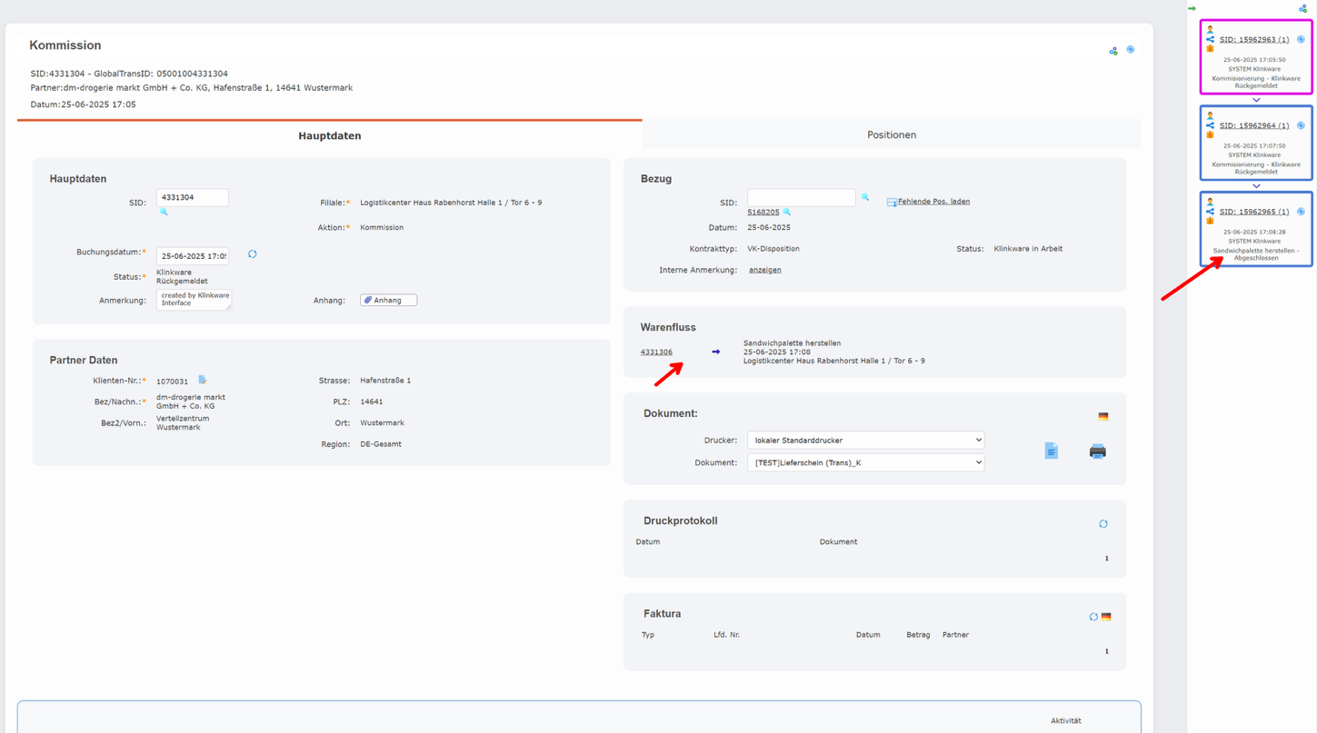 Wird bei der Rückmeldung der Kommission durch Klinkware bei mehreren Paletten die gleiche Trägerpalette übermittelt, so wird automatisch im Zuge des Abschlusses der Kommission durch Klinkware eine Sandwichpalette Herstellung durch das System angelegt. Dabei hängt es vom System ab, ob es sich um ein Stapeln oder eine Fusion von zwei Paletten auf eine handelt. (Sprich ob es sich um 1 oder 2 Europaletten handelt). Für die Sandwichpalette gibt es auch eine eigene Buchung, welche das System anlegt. Diese Buchung kann bei der Kommission bzw. Dem Workflow-Bereich rechts eingesehen werden. Alle kommissionierten Paletten, welche als Sandwichpalette zusammengebaut werden, werden in der Quelle (graue Positionen) angegeben. Die daraufhin gebildete neue Lagereinheit (NVE) wird als Ziel angegeben.