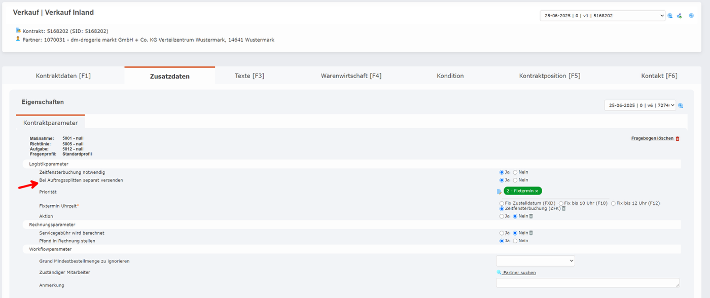 Wird der Verkauf von zwei unterschiedlichen Lagerstandorten kommissioniert und gemeinsam versendet, kann dies im Verkauf im Reiter Zusatzdaten mit der Frage “Bei Auftragssplit separat versenden” ja/nein eingestellt werden.