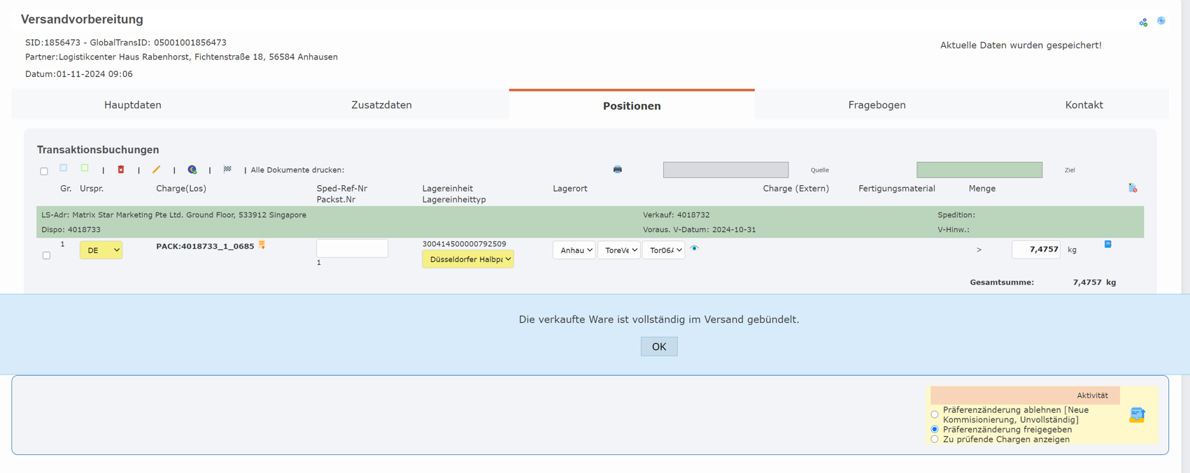 Nachdem das Paket der Kommission zur Versandvorbereitung geladen wurde, kann diese über die Aktivität gespeichert werden. Diese Aktivität versetzt den Vorgang in den Status „Angedockt“. Nachdem die Ware auf Vollständigkeit geprüft wurde, wird eine Meldung angezeigt, falls sich die gesamte Ware aus der Disposition in der Versandvorbereitung befindet.