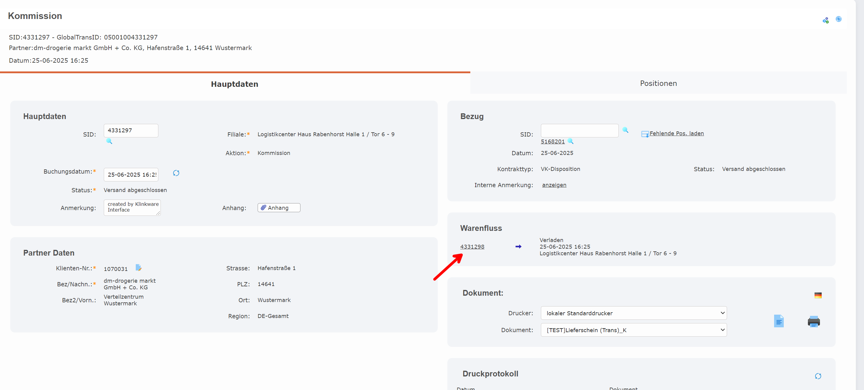 - Strecke: Es wird direkt eine Verladung angelegt. Dies wird nur solange automatisch angelegt, solange die Anmeldungen bei DHL sowie die Verladescannung noch von CSB übernommen werden. In diesem Fall wird bei der letzten Kommission ein Lieferschein erstellt und direkt an den Drucker gesendet (am Testsystem wird das Dokument lediglich generiert und bei der Kommission hinterlegt).