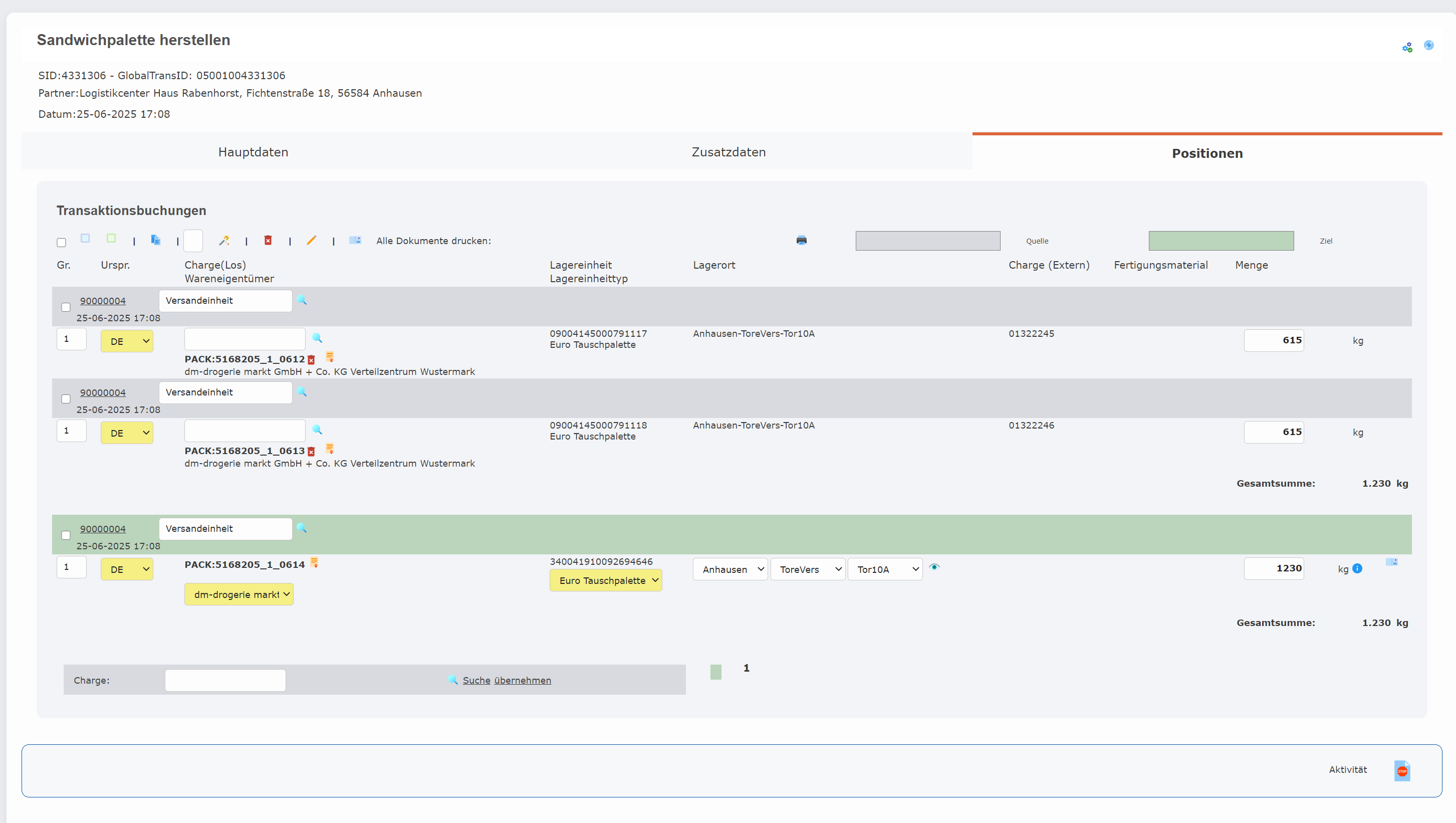 Wird die Sandwichpalettenbildung abgeschlossen, wird eine neue Position inkl. Lagerort automatisch generiert und es ist keine erneute Aktivität mehr möglich.