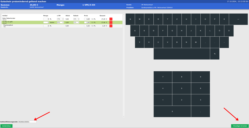 Verkauf: Standardverkauf von Kartons und einzelnen Flaschen, manuelle Artikelerfassung, Pfandrückgabe - Achtung Unterscheidung nach Karton und Flasche