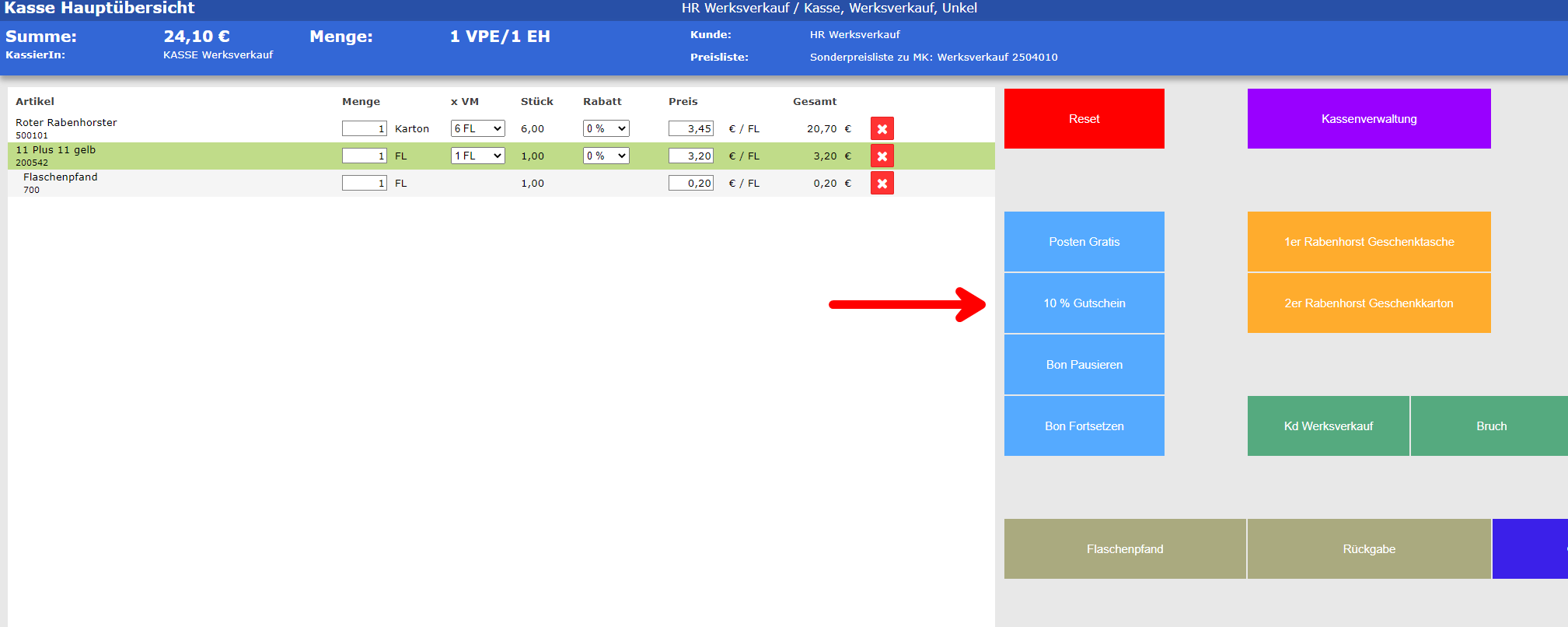 Es ist ebenso möglich, Rabatte manuell auf der Kasse zu gewähren: