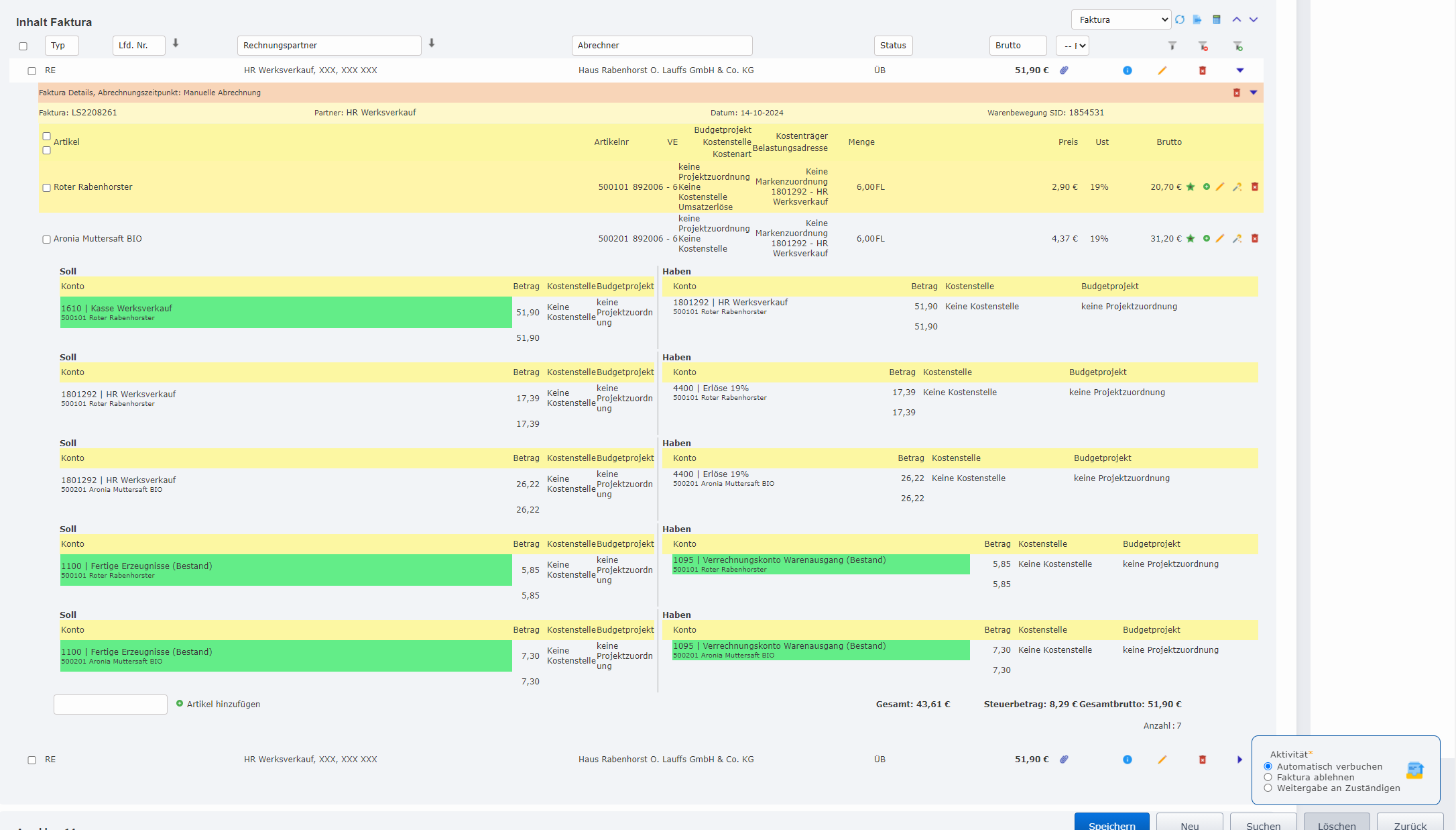 Hier werden dann sämtliche Buchungssätze angezeigt. Mit einem Klick auf „Automatisch verbuchen“ wird der Auftrag verrechnet.