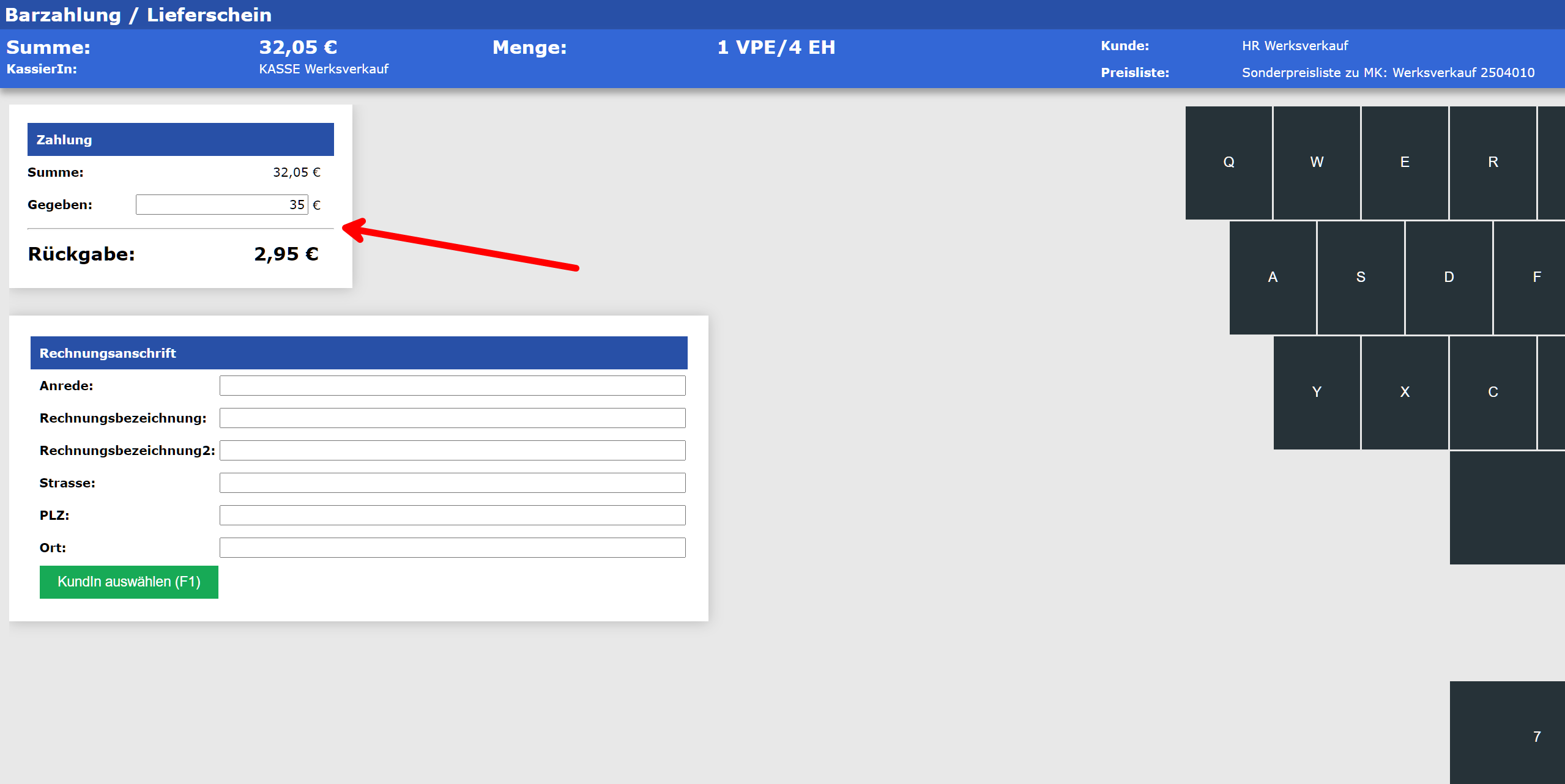 Mit einem Klick auf Enter, übernimmt das Kassensystem diese Menge und notiert sie hier: