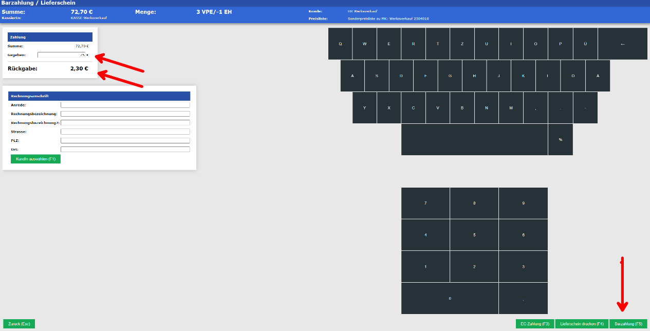 In der Zahlungsübersicht wird gesteuert, wie der Kunde bezahlen möchte. Wird mit Karte bezahlt, genügt ein Klick auf EC-Zahlung. Bei einer Barzahlung muss das erhaltene Bargeld eingegeben werden und dann der Barverkauf mit „Barzahlung“ bestätigt werden.