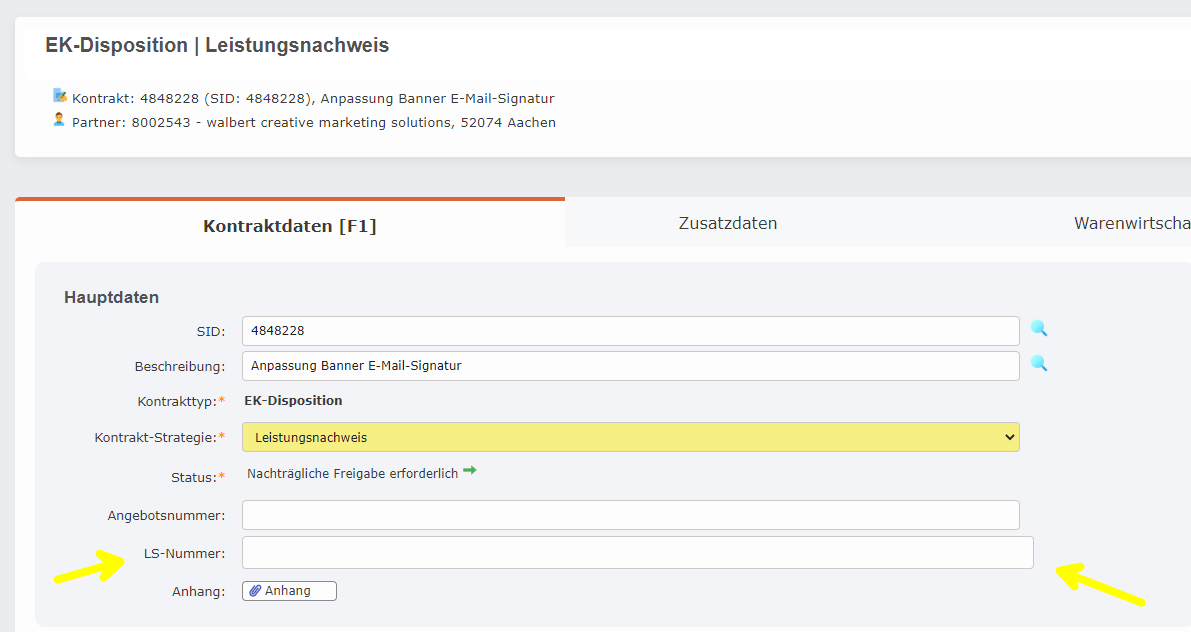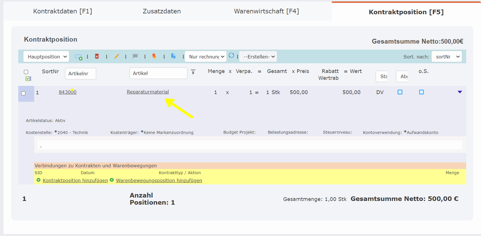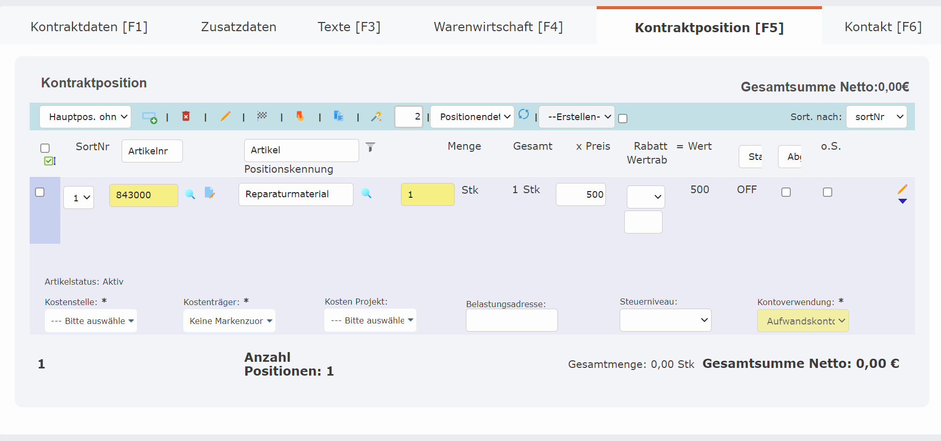 Ob der Betrag im Reiter Kontraktposition (F5) angepasst werden muss hängt davon ab ob es Abweichungen zur Bestellung gibt.