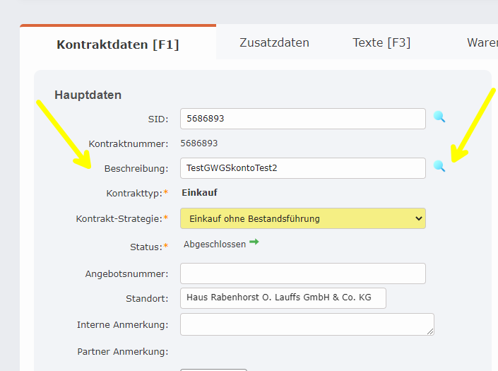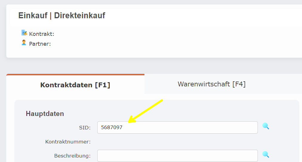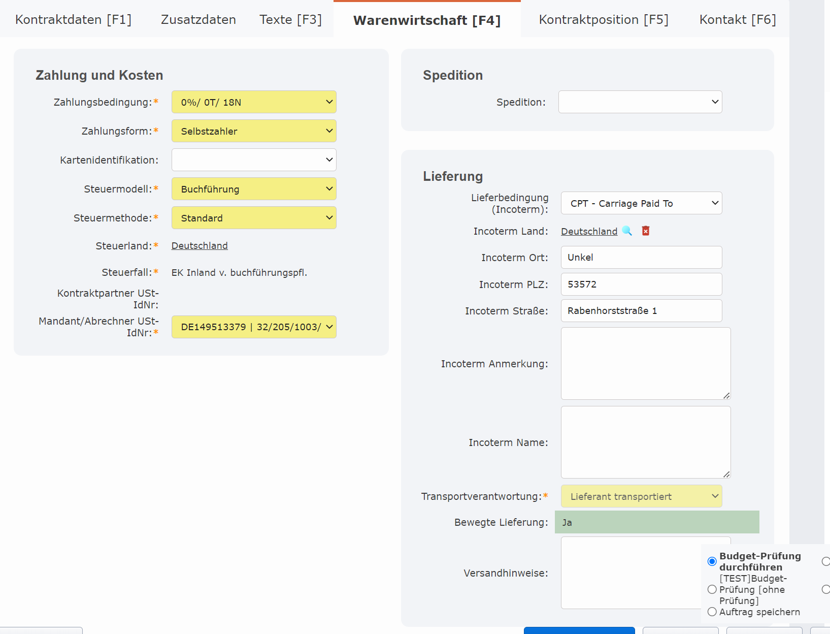 Im Reiter Warenwirtschafts können kontraktspezifische Einstellungen vorgenommen werden. Es werden die Daten aus dem Partnerstamm automatisch übernommen.