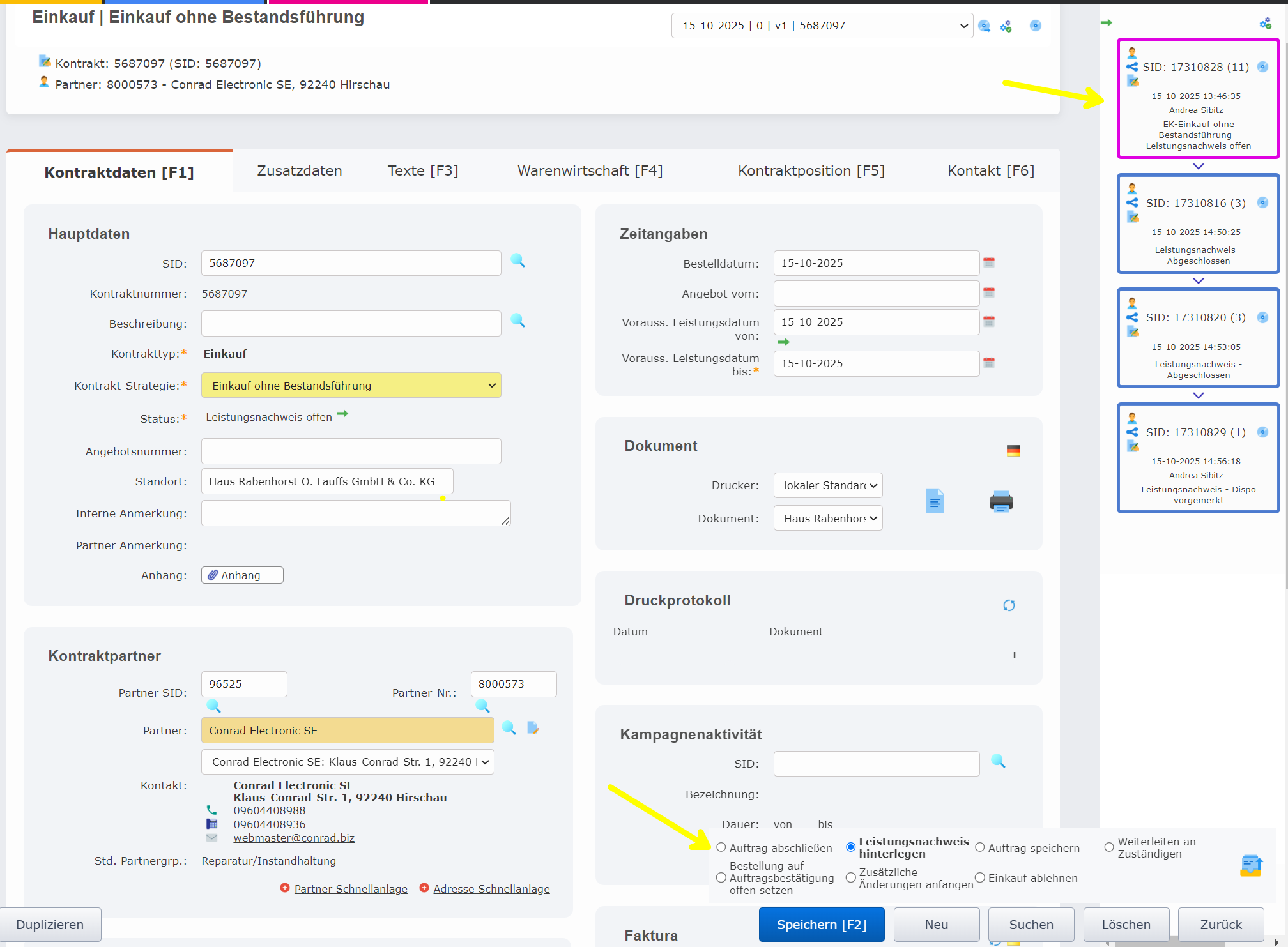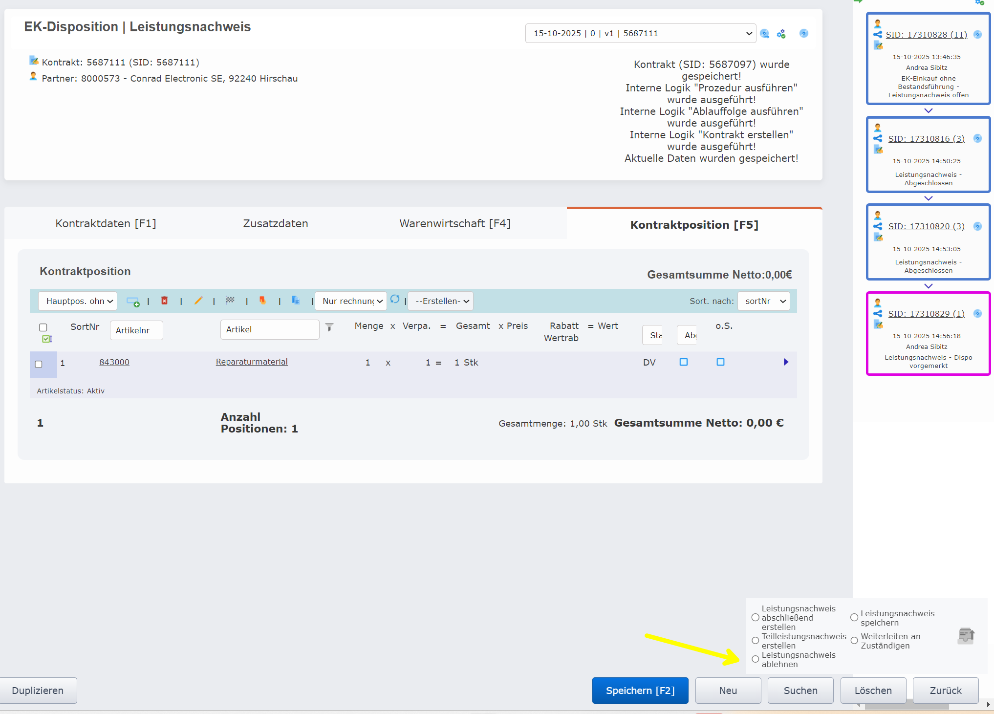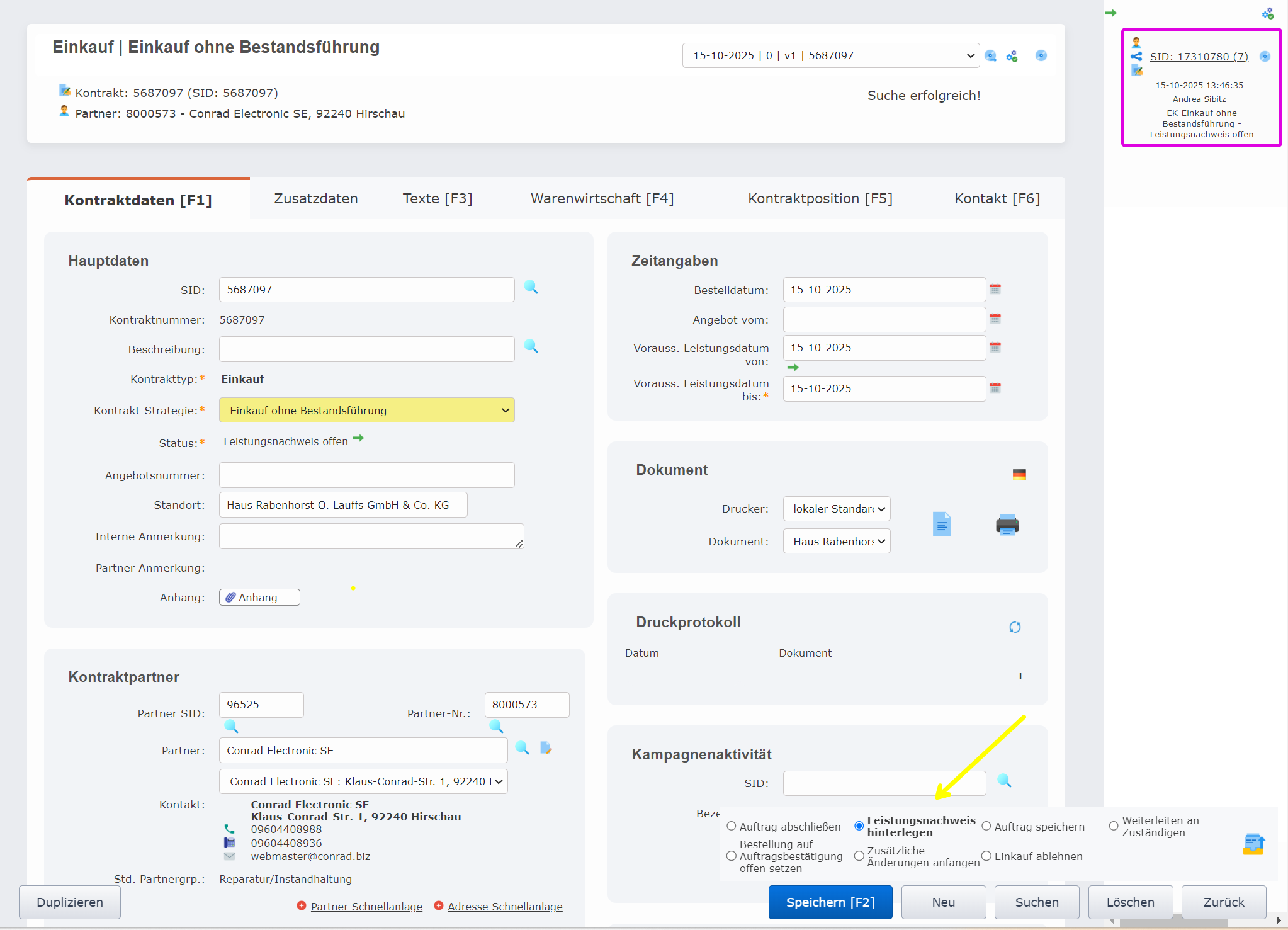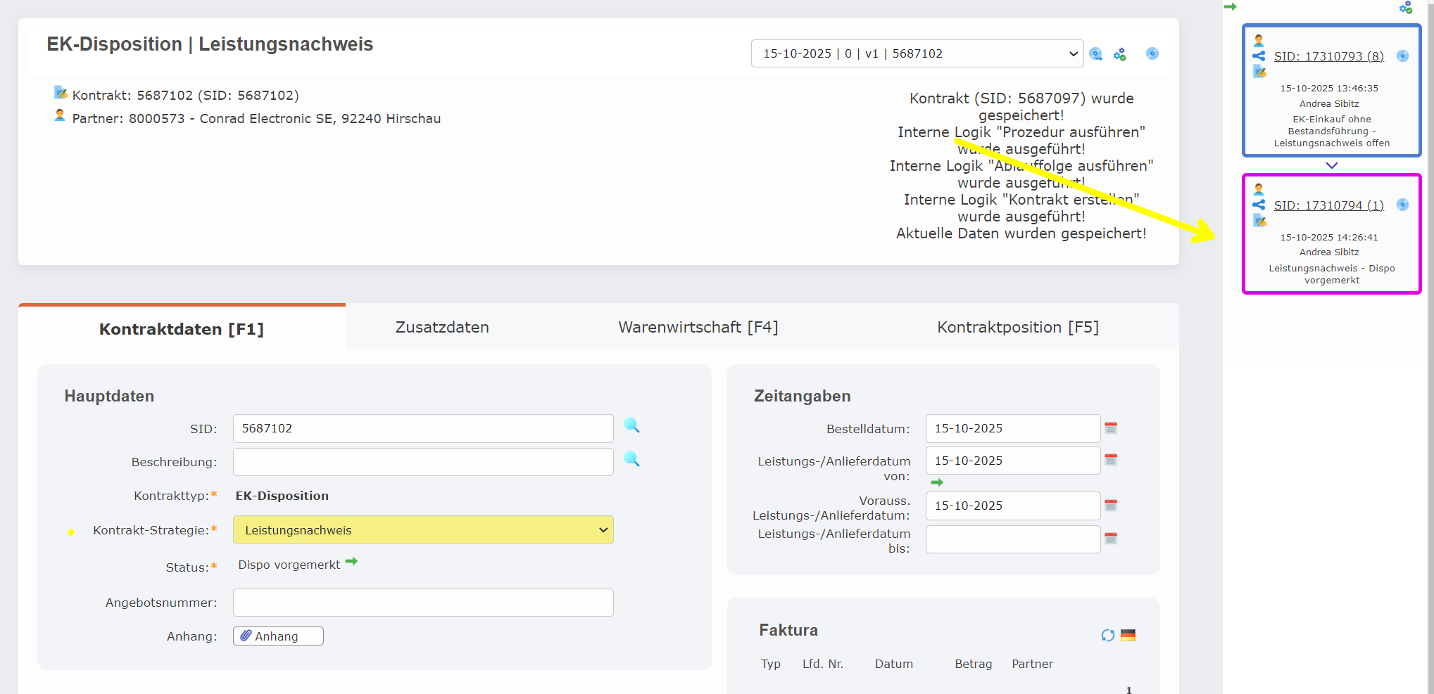 Es wird eine EK-Disposition / Leistungsnachweis angelegt und direkt in der Historie mit dem Einkauf verknüpft.
