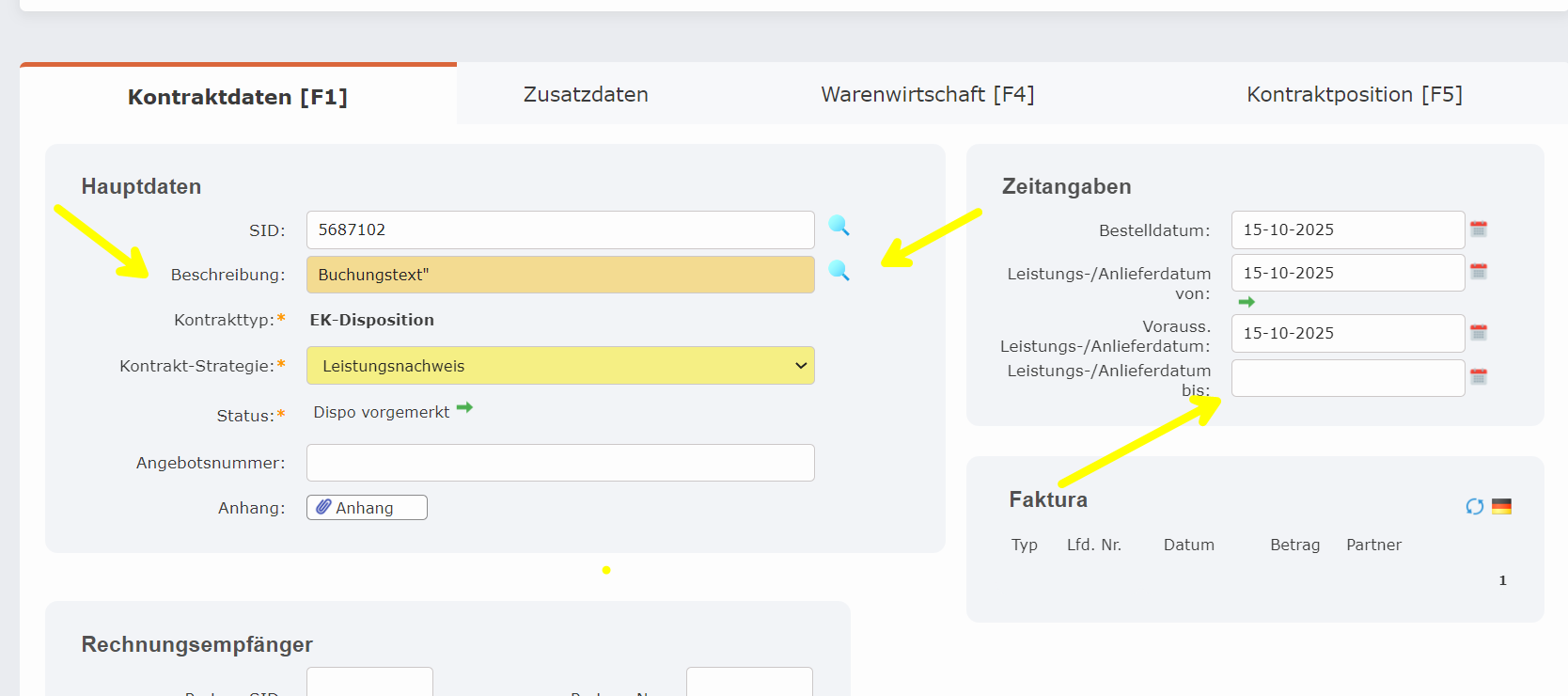 Dieser Buchungstext kann in jeder Stufe (EK-Kontrakt - EK-Dispo/Leistungsnachweis - Fakturierungsauftrag - Buchungsjournal) noch geändert werden. Wichtig für Jahresbestellungen - hier kann in der Bestellung ein allgemeiner Text angegeben werden (Bsp. Ersatzteile Conrad 2025). Im daraus angelegten Teil-Leistungsnachweis kann dann im Leistungsnachweis der Text auf die konkrete "Anforderung" geändert werden.