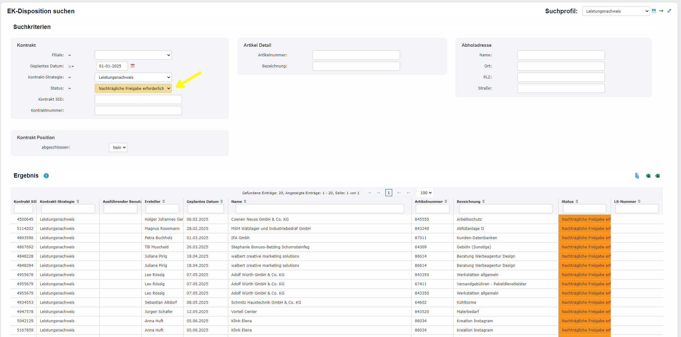 Für die Leistungsnachweis-Suche haben wir ein extra Suchprofil erstellt. Zu finden ist dieses unter dem Menüpunkt EK-Disposition, Suchprofilname: Leistungsnachweis