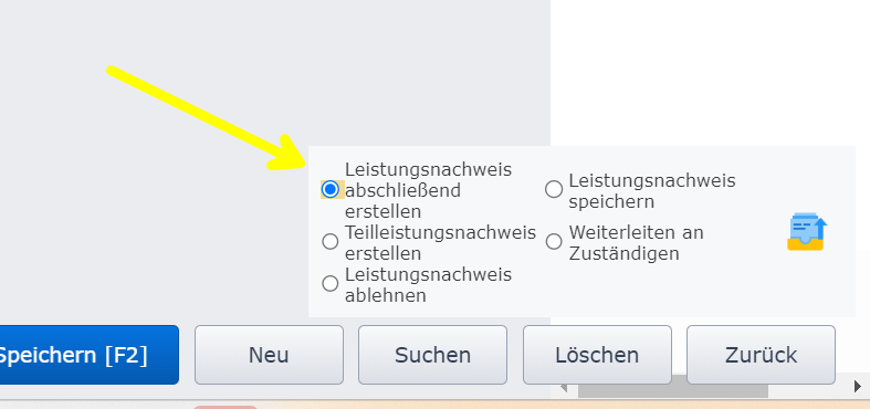 Nach den erfolgten Änderungen muss entschieden werden ob die Bestellung vollständig erfüllt ist, dann führt man den Workflow "Leistungsnachweis abschließend erstellen" aus. Hier wird auch die verknüpfte Bestellung abgeschlossen.