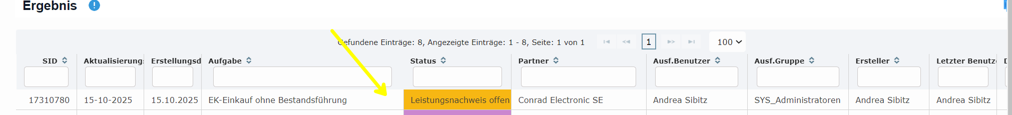 Nun wechselt der EK-Einkauf in den Status "Leistungsnachweis offen" und wird erst wieder nach erfolgter Lieferung/Leistung benötigt.