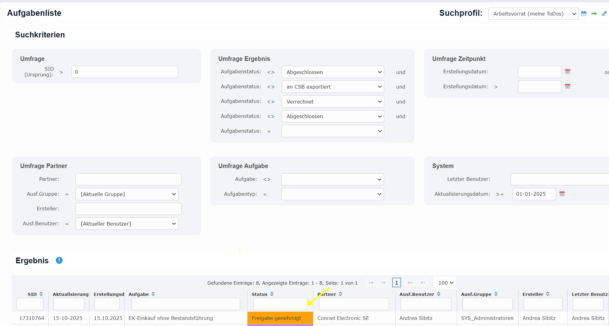Weiters erscheint die notwendige Freigabe in dem Suchprofil „Arbeitsvorrat – (wichtige Abteilung ToDos)“ wie folgt: