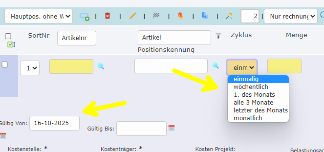 In der Vertragsposition muss ein Zyklus eingestellt werden. Standardeinstellung ist einmalig. Hier kann man zwischen folgenden Zyklen auswählen.