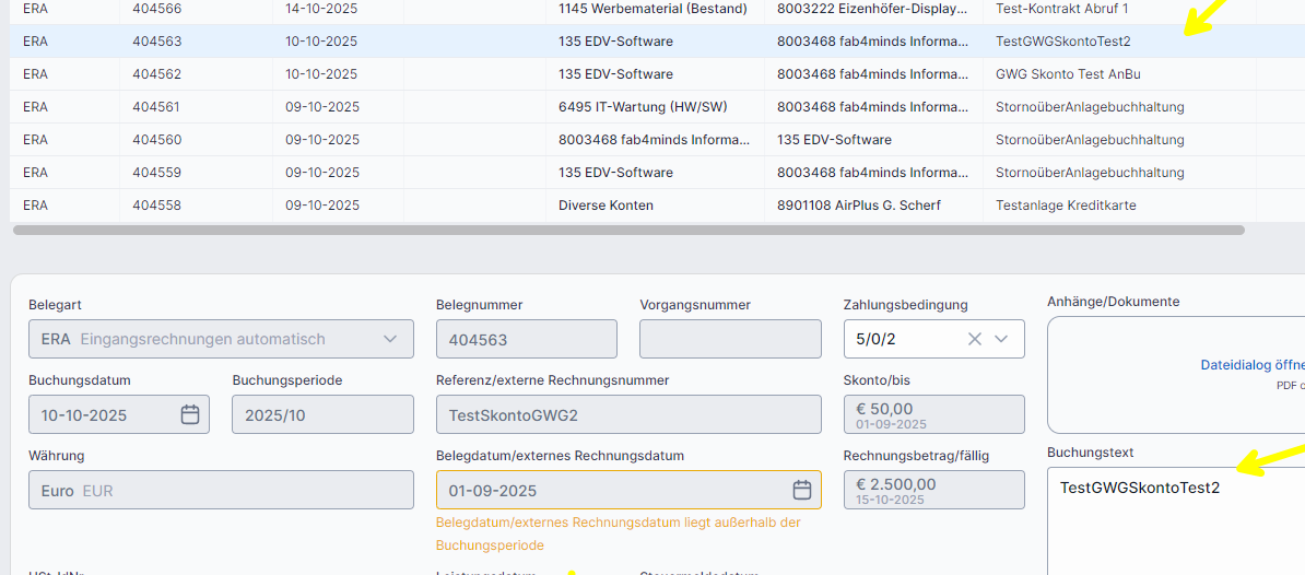 Leistungs-/Anlieferdatum bis: Pflichtfeld - dieses Datum wird auch für die richtige Steuerperiode benötigt. Sollte auf den Lieferscheinen des Lieferanten vermerkt sein. (Leistungsdatum kann ungleich des Belegdatums sein).