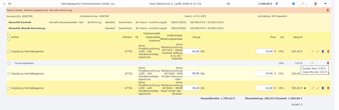 Hinweis: Bei der Rundungsposition kann es aufgrund der Darstellung mit zwei Nachkommastellen dazu kommen das nur 0,00 steht. Wenn der Btto Betrag wie im obigen Beispiel 0,02 ist würde der Nettobetrag drei Kommastellen erhalten.