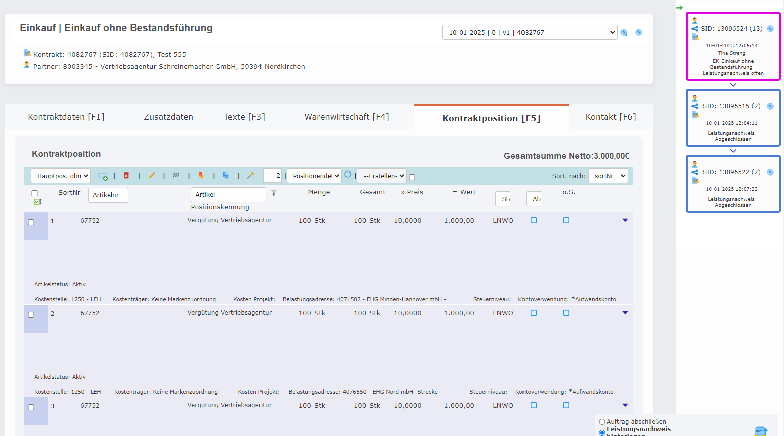 Es können zu einem Einkauf mehrere Leistungsnachweise erstellt werden. Ob jeweils ein oder mehrere Einkäufe für die Leistungsnachweise erstellt werden, hat Auswirkungen auf die Reservierung der Budgets und ist eine unternehmerische Entscheidung. Sobald ein Leistungsnachweis abgeschlossen ist, ist dieser Bereit zur Fakturierung.