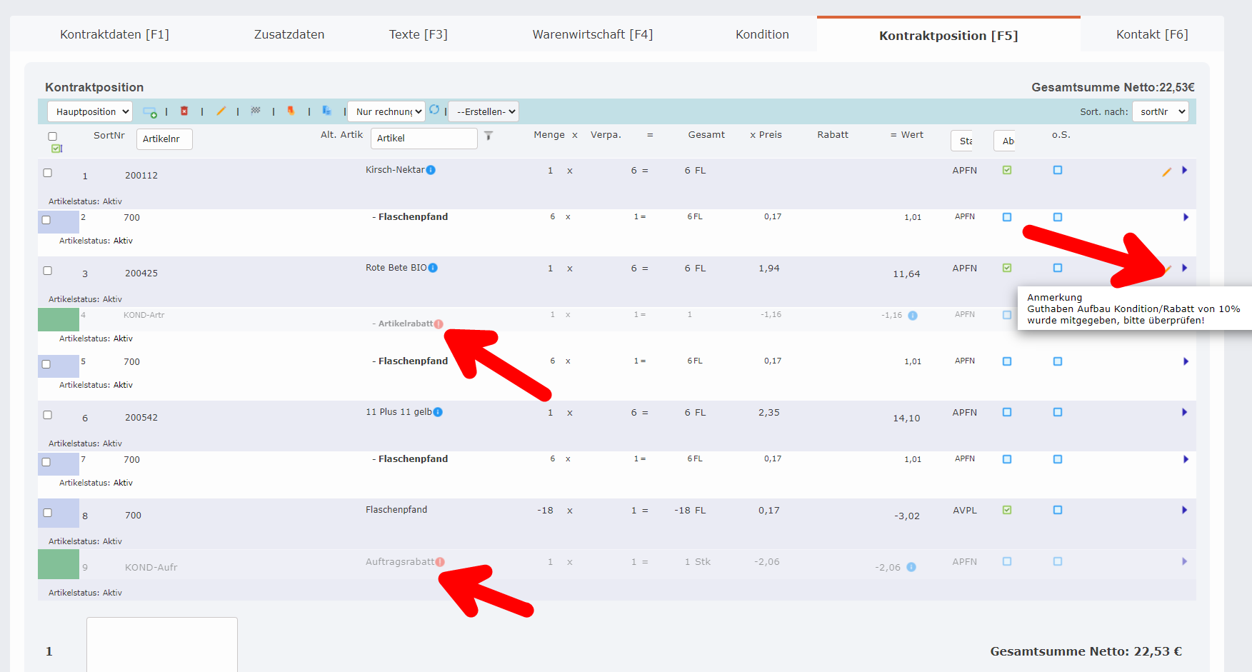 - Es wird kein Flaschenpfand gutgeschrieben in der Auftragserfassung bei „Minus-Positionen“ richtig? Welche Fälle gibt es. Eigentlich nur Verkostung und MHD. Der Rest ist mit Warenbewegung und nicht Minus