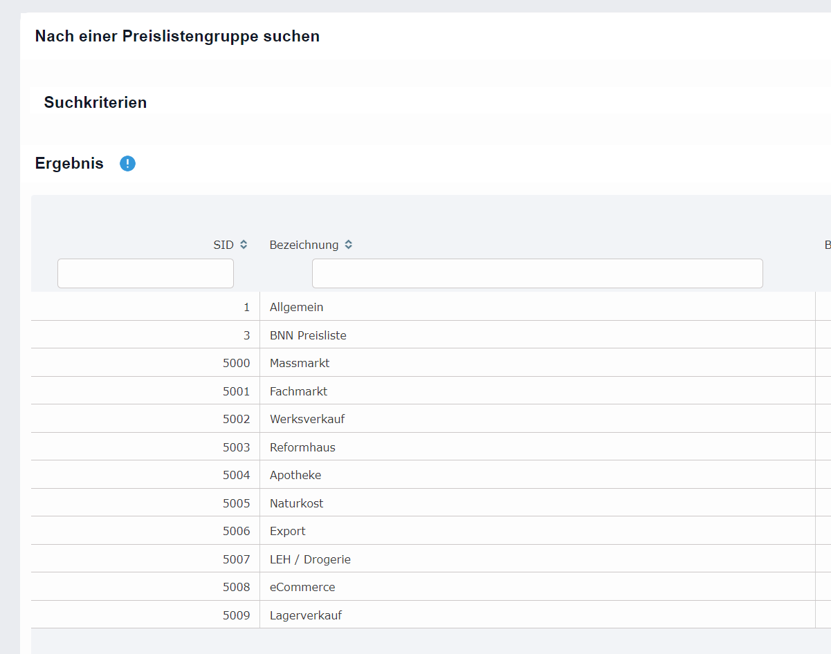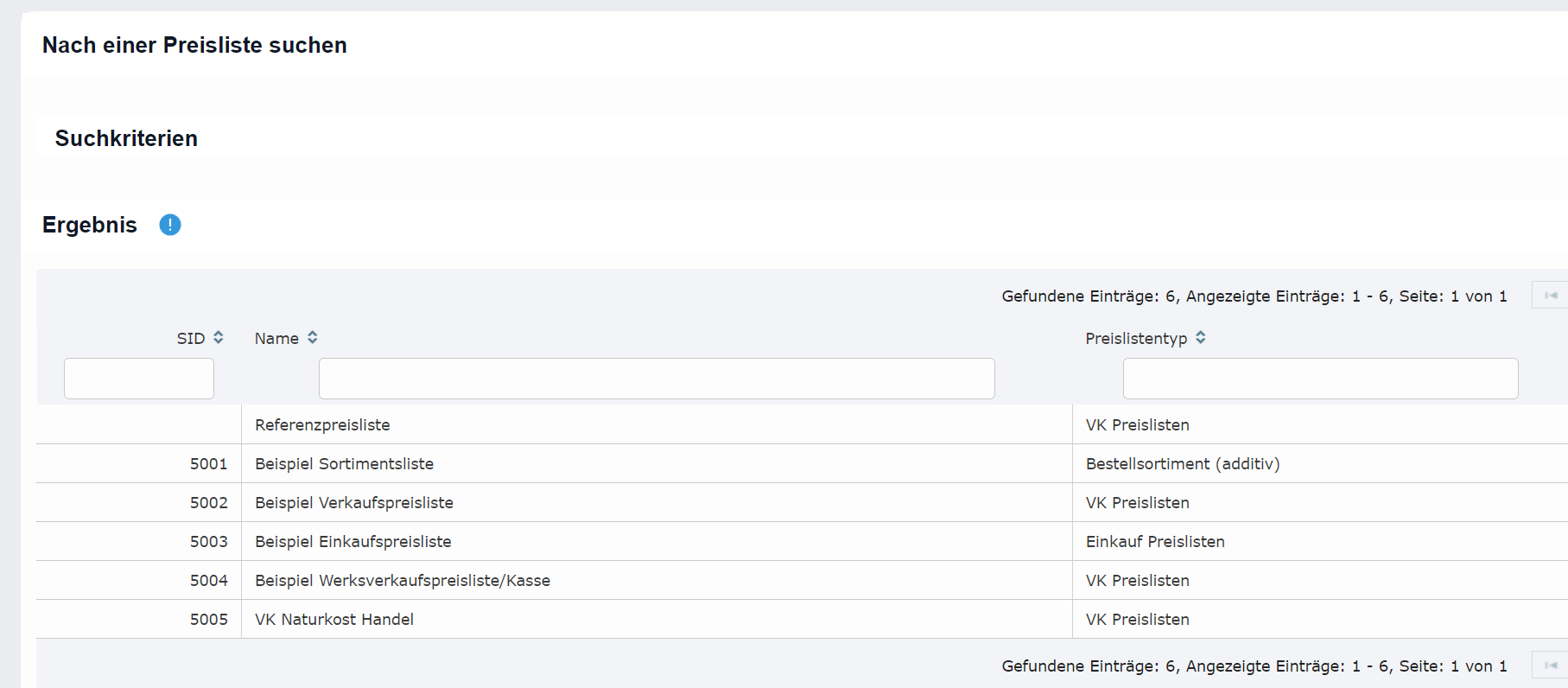 Abbildung - Beispielhaft angelegte Preislistentypen, Ausgabe über die Suche im Menü Preislistentyp