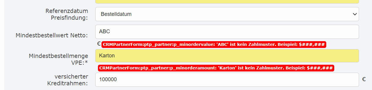 „freizugebender Kreditrahmen“ und „versicherter Kreditrahmen“ sind jeweils freie Eingabefeld für Zahlenwerte. Beide vergleichen bei jeder Bestellung den Wert dieser mit der Summe der Werte der noch offenen nicht bezahlten Bestellungen. Wird der Kreditrahmen Wert überschritten gibt es eine Hinweismeldung und die Bestellung muss durch einen Mitarbeiter freigegeben werden. Das Feld für den versicherten Kreditrahmen dient zur optionalen Angabe der Höhe der Versicherungssumme welche die Versicherungspolice im Fall des Zahlungsausfalls des Partners deckt. Wir geben beispielhaft jeweils den Wert 100.000 EUR an.