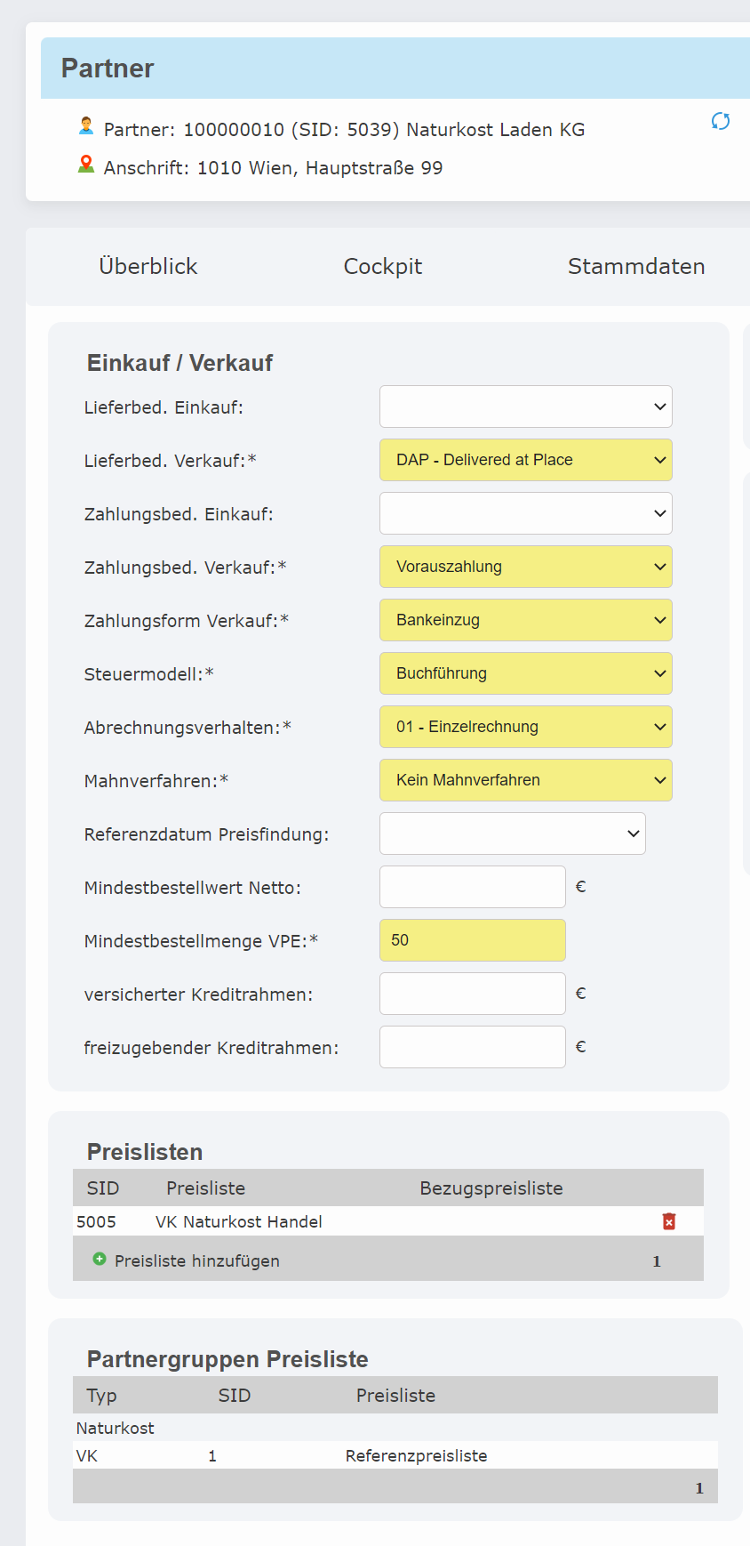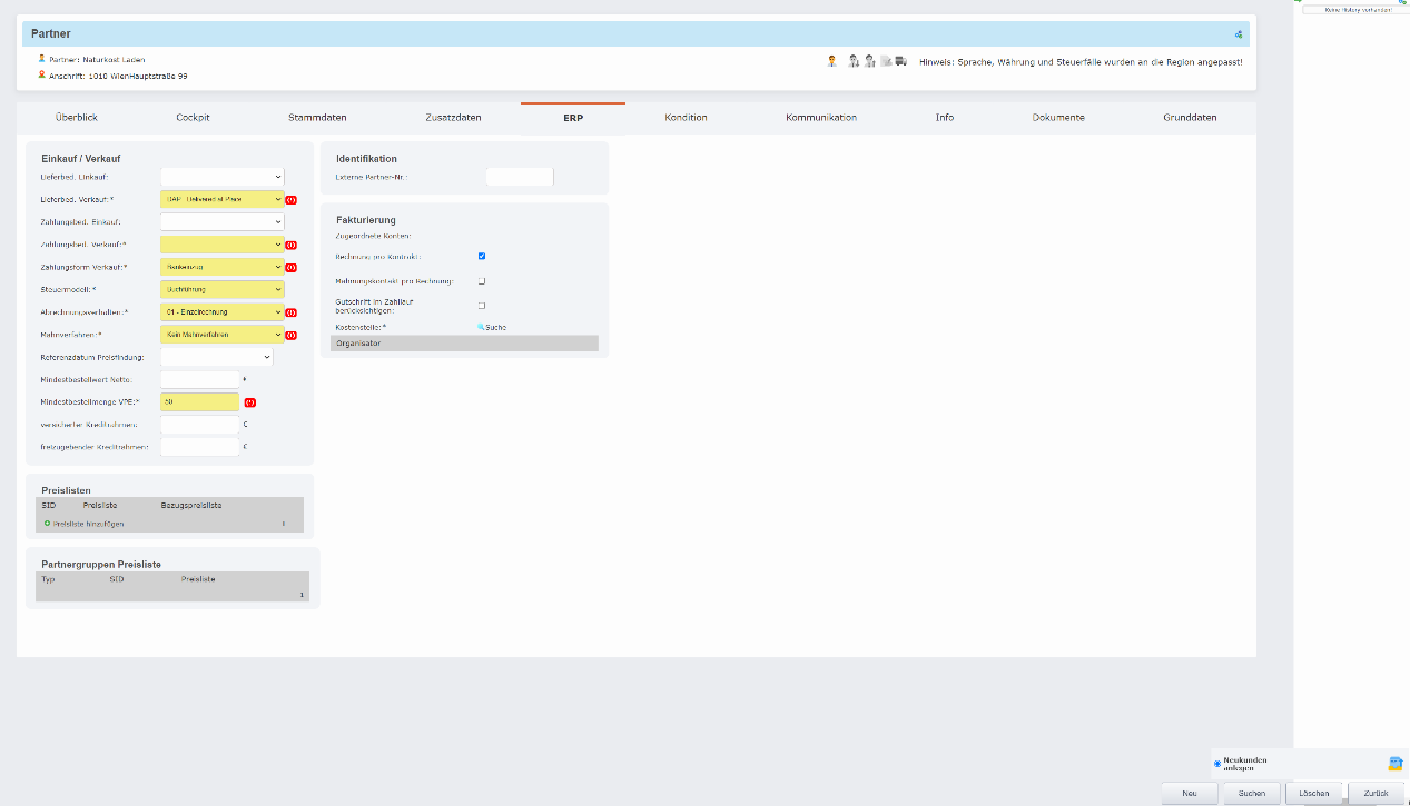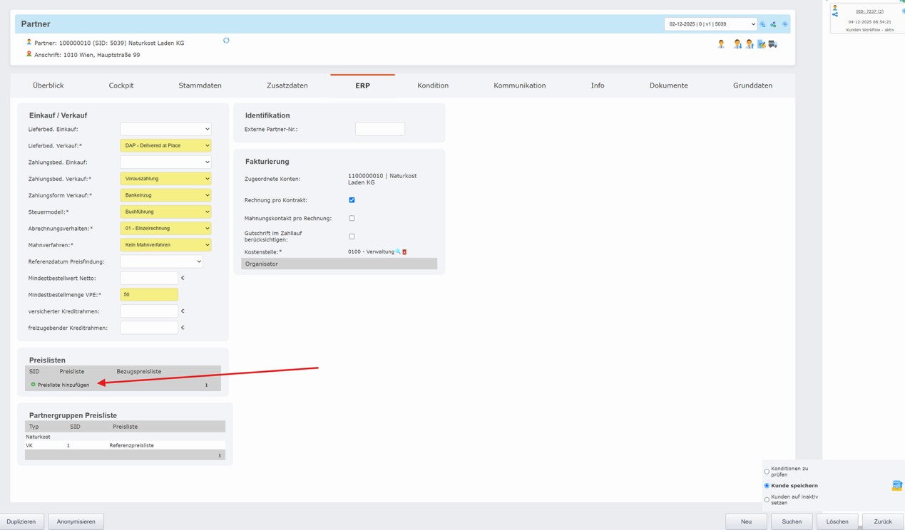 Preislisten lassen sich bei Partnern im Tab „ERP“ hinterlegen. Beispielhaft hinterlegen wir die Preisliste „VK Naturkost Handel“ beim Partner „Naturkost Laden KG“.