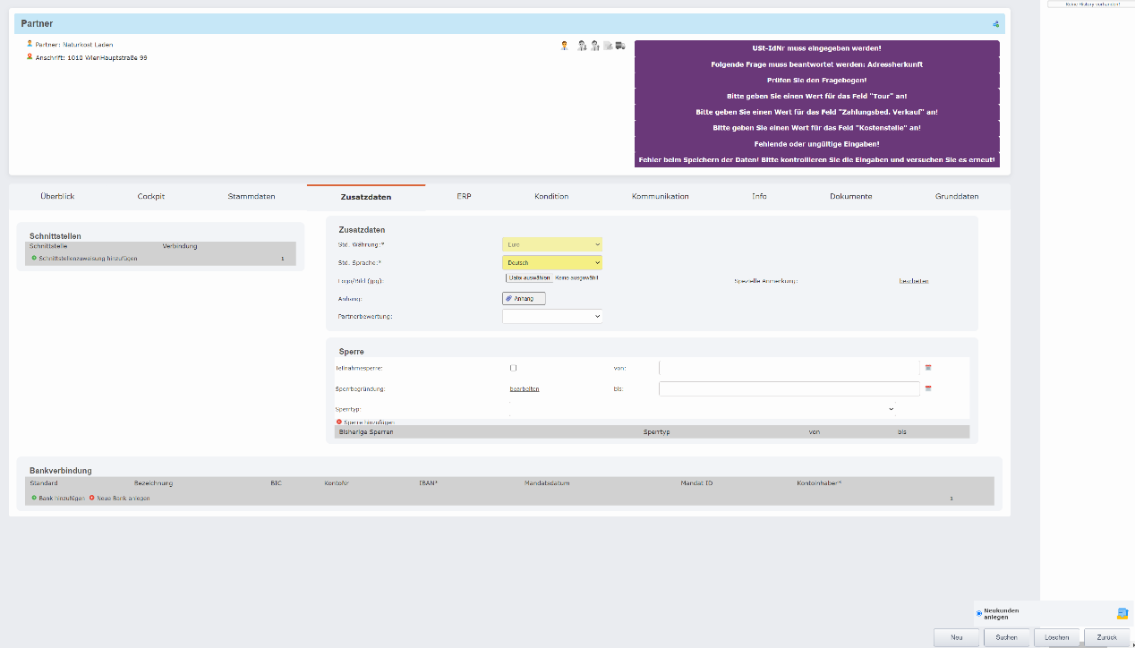 Abbildung - Partner Tab Zusatzdaten, mit Hinweismeldung oben rechts über fehlende Pflichtangaben