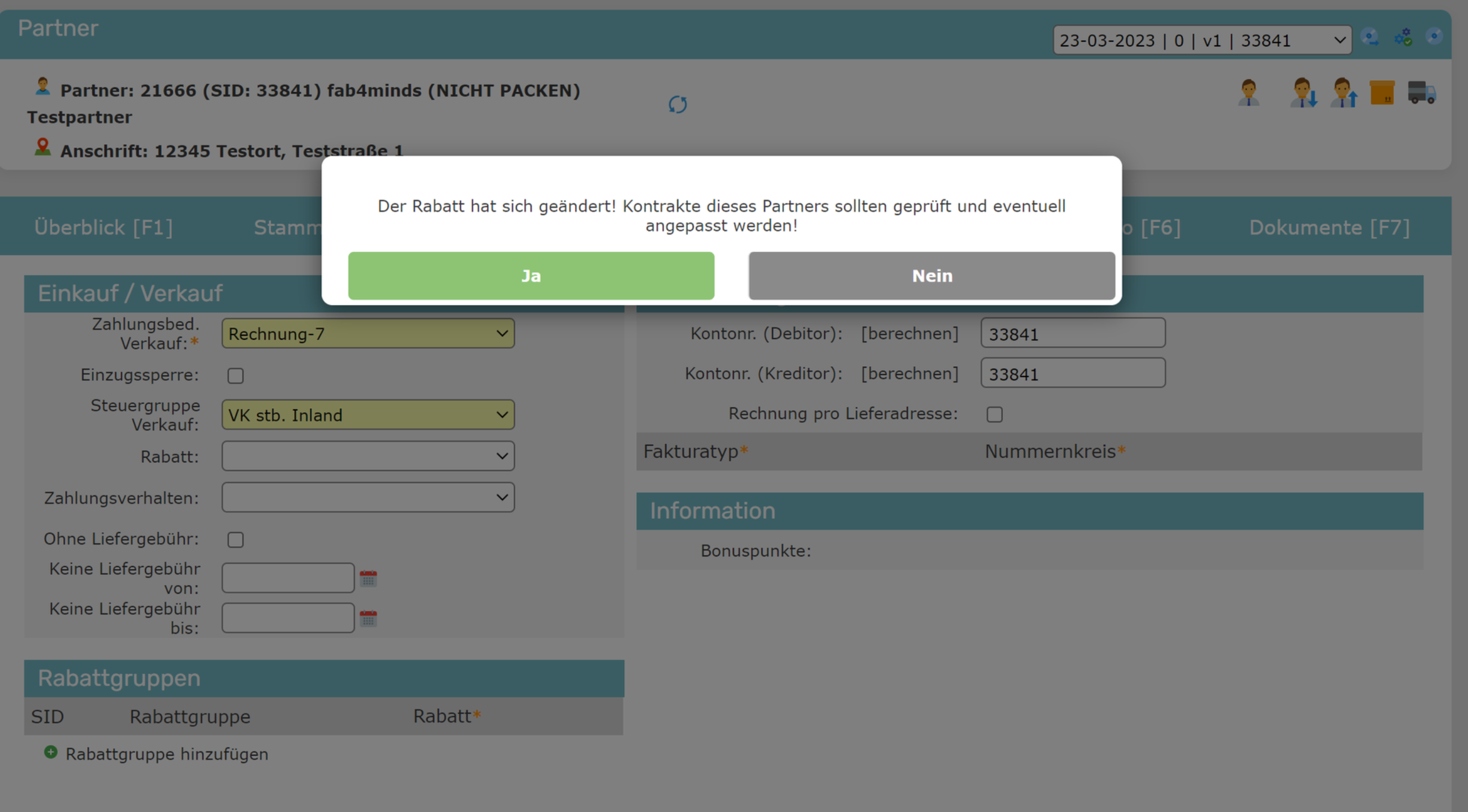 Wird ein Rabatt im Kundenkonto geändert, soll eine Abfrage erfolgen, ob der aktualisierte Rabatt auf zukünftige Lieferungen (Verkauf und Dispo, zyklische Verkäufe fragwürdig bzgl. der Nachvollziehbarkeit) übertragen werden soll. Diese Abfrage soll mit Ja/Nein beantwortet werden können.
