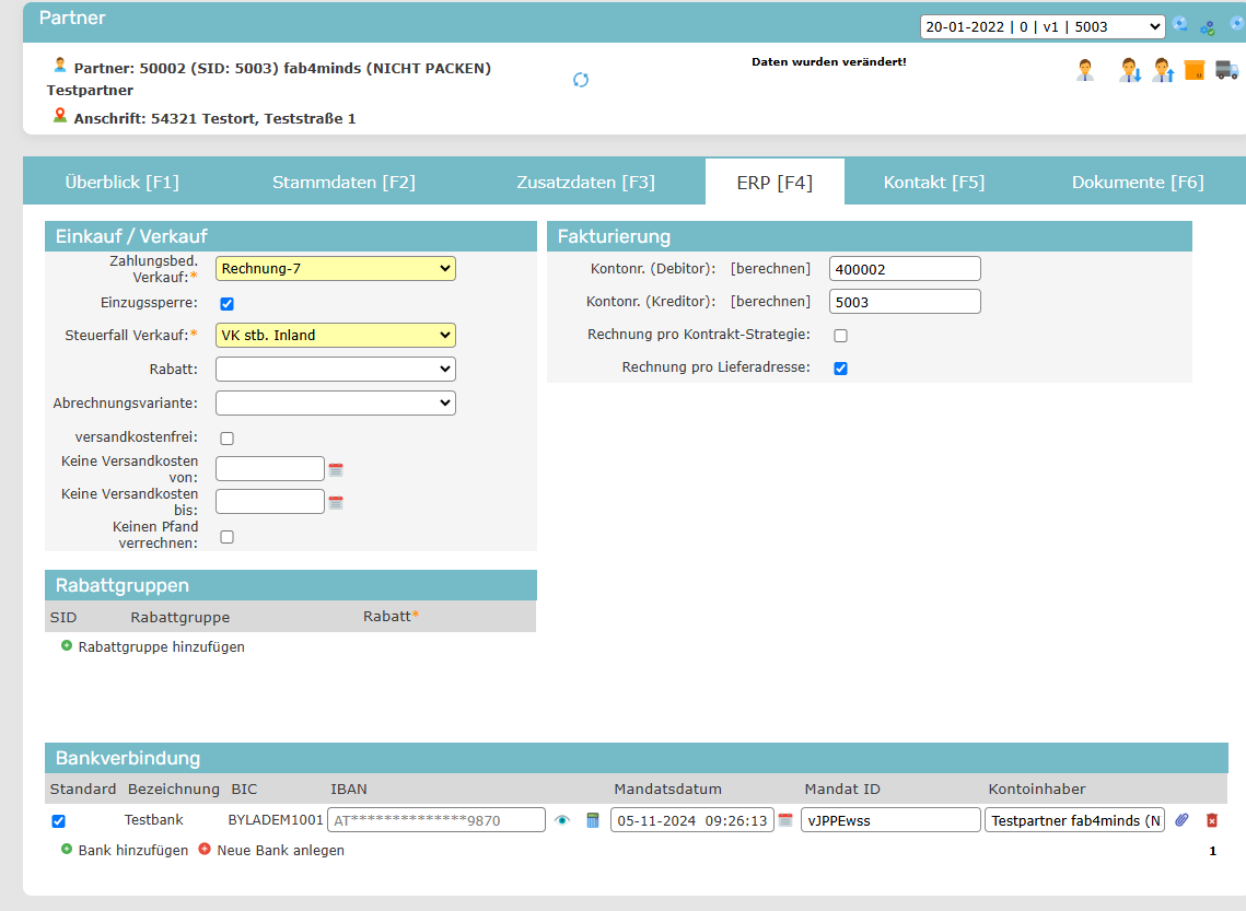 Aktuell ist es möglich die Bankdaten, die beim Partner hinterlegt sind, zu ändern. Das kann nun verhindert werden, indem diese Felder als default nicht bearbeitbar sind: