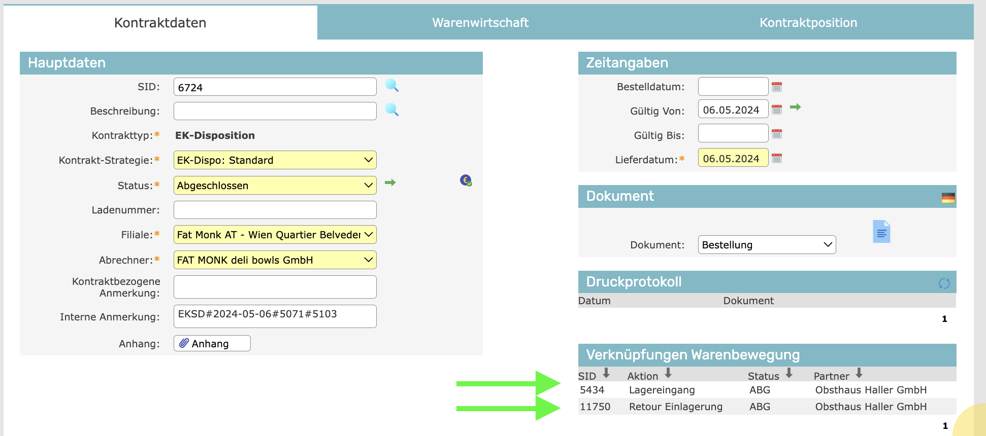In der EK-Disp sehe ich aktuell Lagereingang und Retour Einlagerung