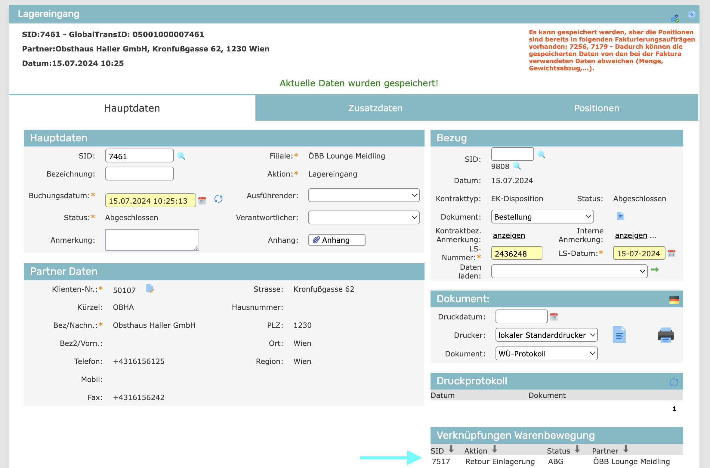 Im Lagereingang kann man ab sofort ebenfalls einsehen, dass es eine Retour-Einlagerung gibt: