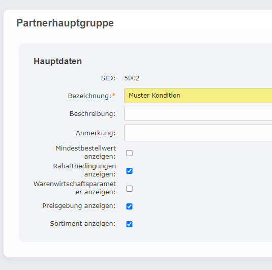 Testfall (Partnergruppe) angelegt, in der Partnerhauptgruppe konfiguriert und die Partnergruppe auf den Partner (beim Speichern des Partners nach dem Auswählen der Partnergruppe) übernommen