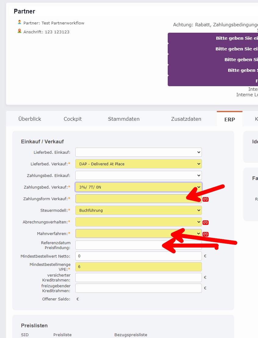Partnergruppe: Zahlungsform, Referenzdatum, Mahnverfahren