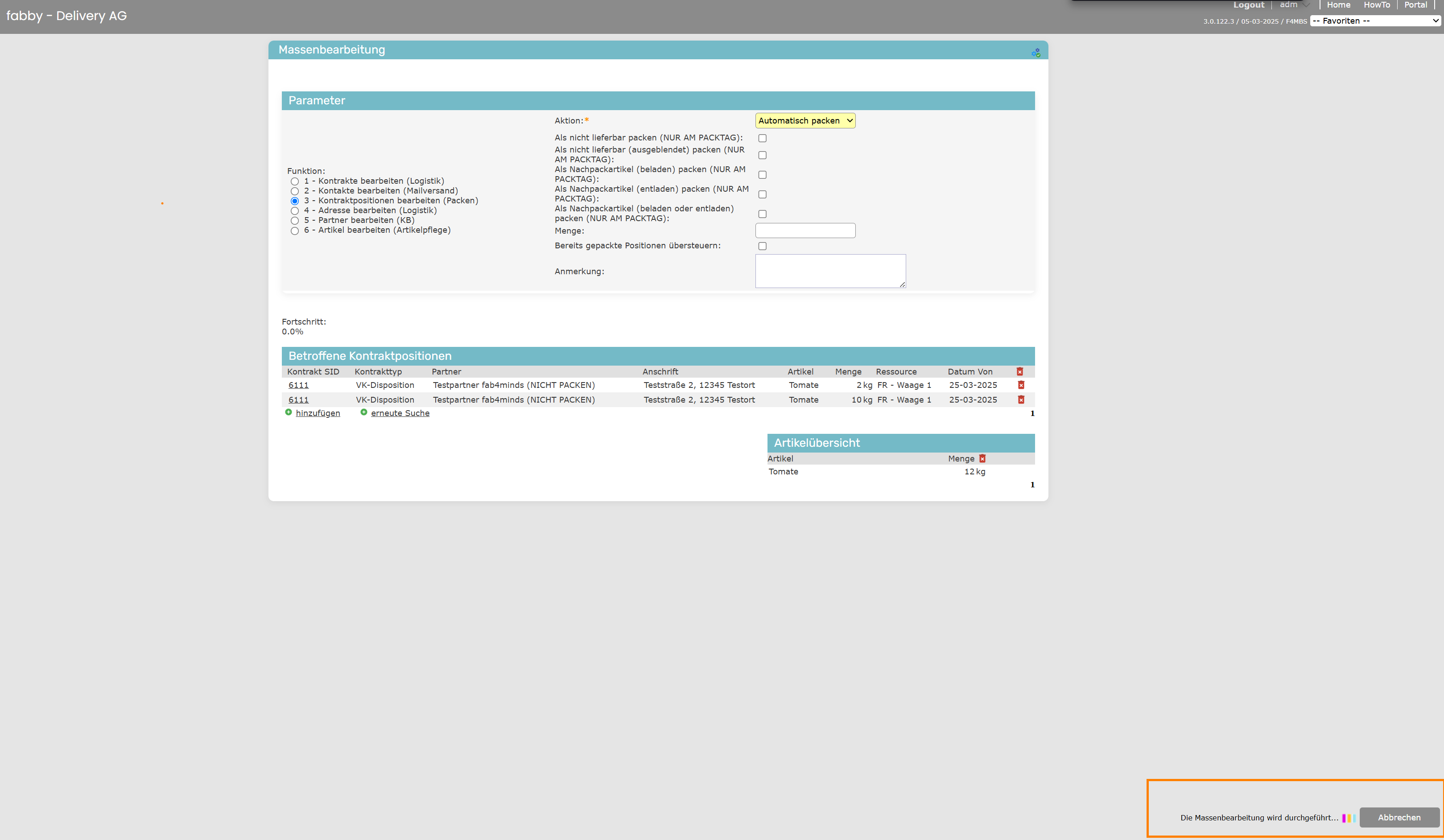Es wird nun ermöglicht, die Massenbearbeitung abzubrechen. Der Prozess wird in einer eigenen Transaktion ausgeführt, sodass die gesamte Transaktion abgebrochen werden kann und keine Teilmassenbearbeitung erfolgt.